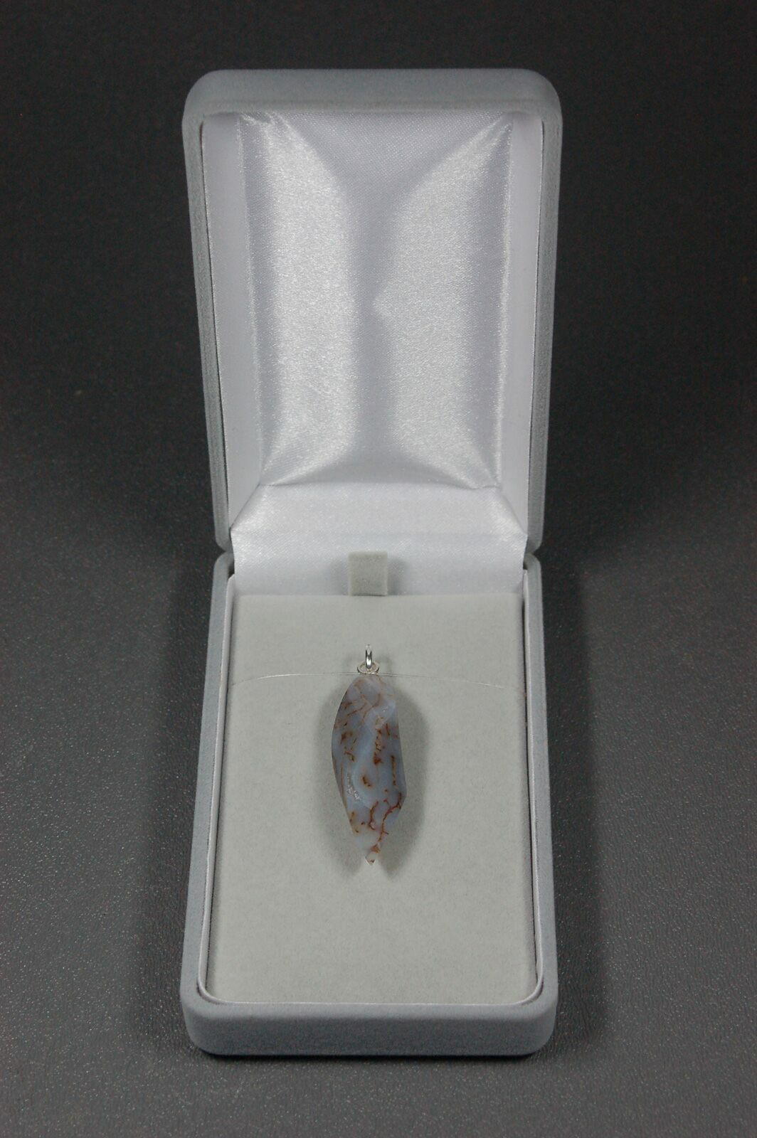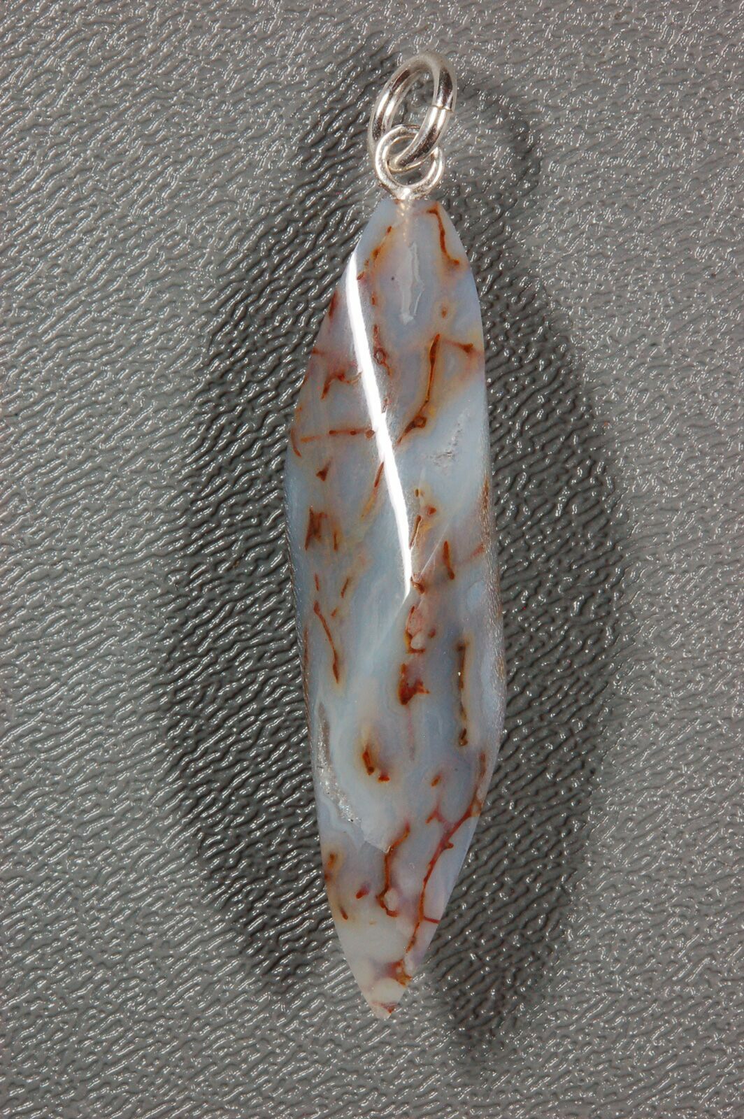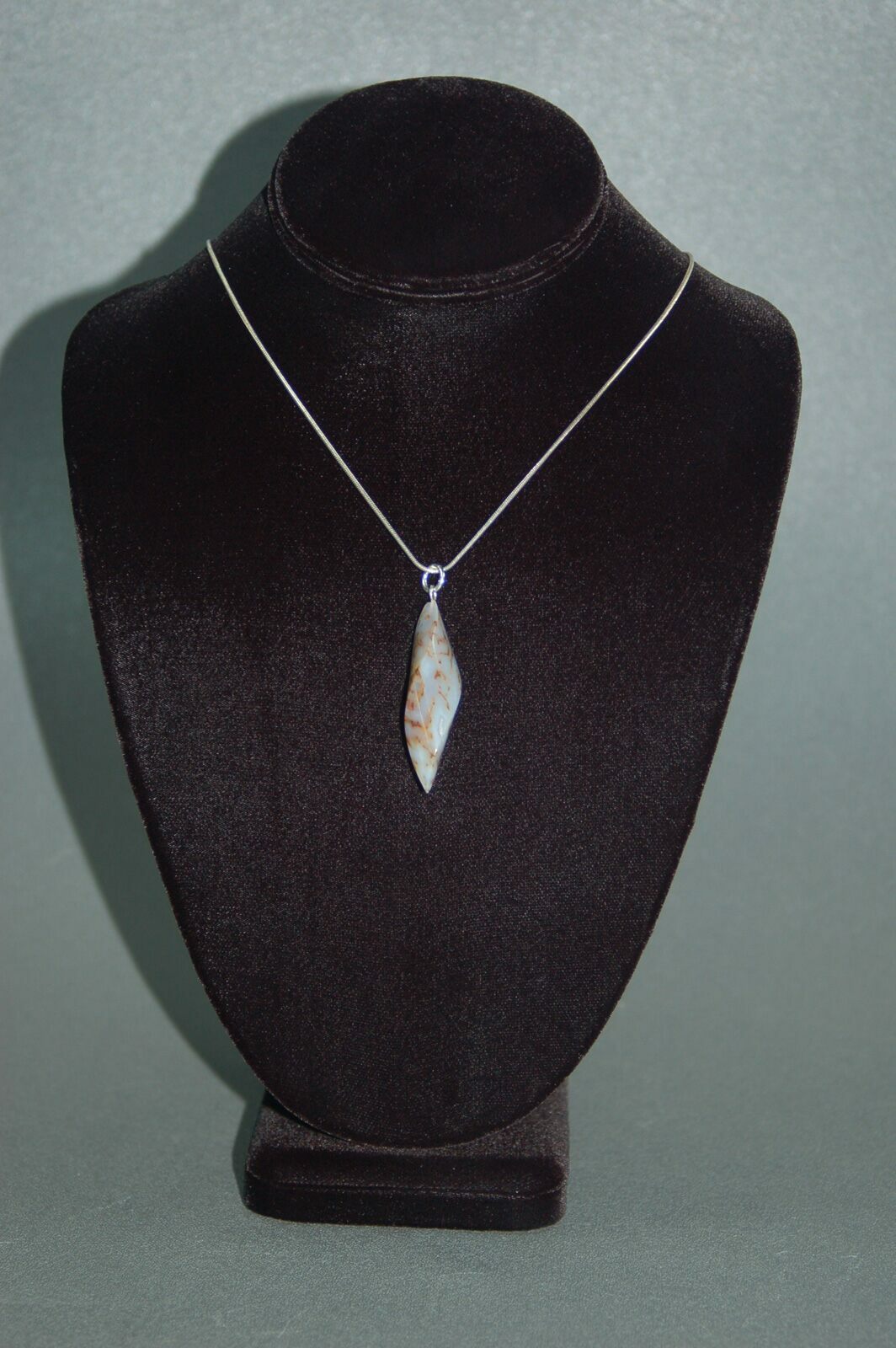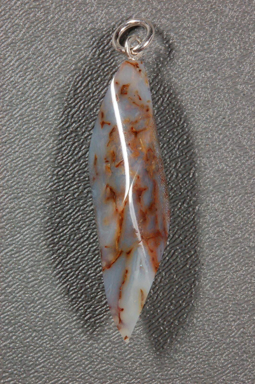 This is a gorgeous twist pendant hand crafted from 150 million year old, agatized dinosaur bone by master stone craftsman, Kenneth Kolb. The amazingly agatized cell structure of the bone creates a blue and orange, spiderweb like appearance. This one of a kind pendant is 1 7/8" x 1/2"