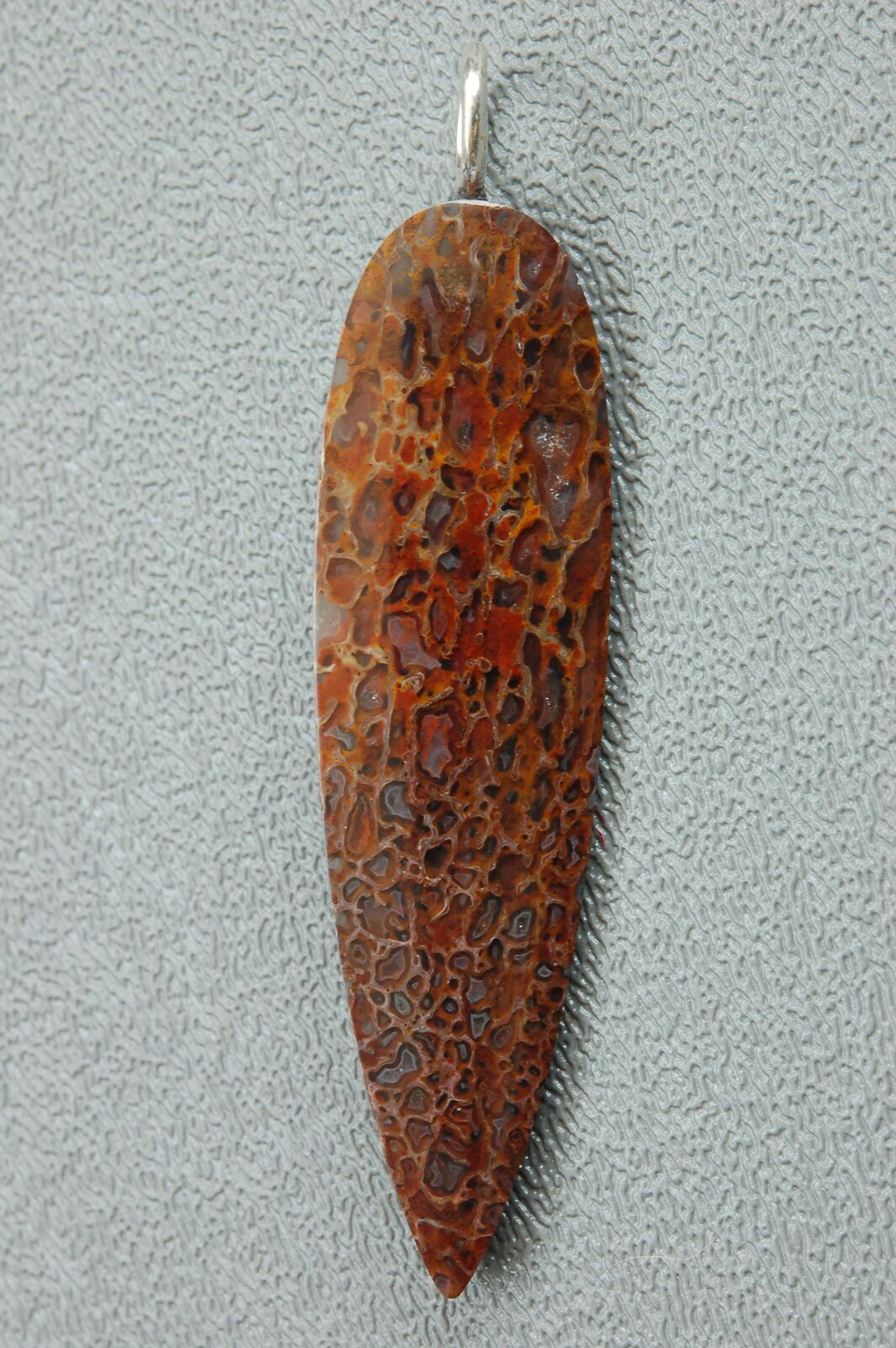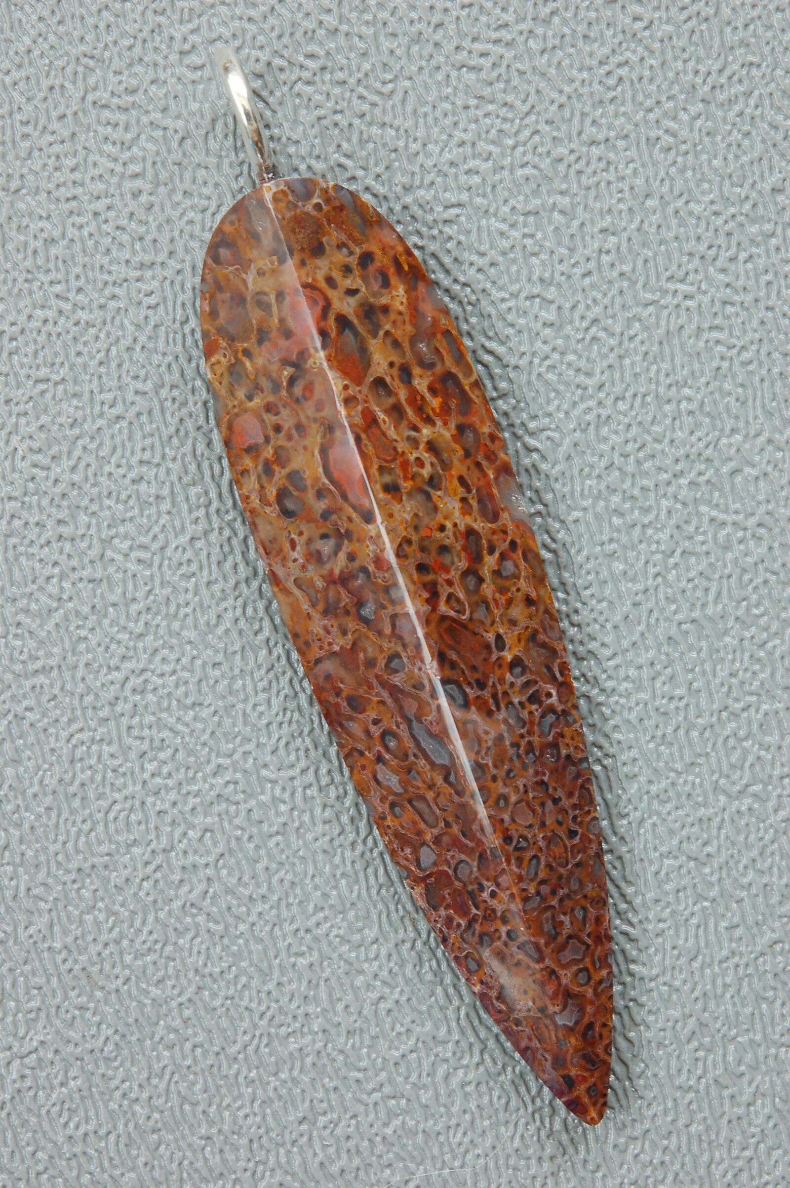 This is a beautiful spear shaped pendant hand crafted from 150 million year old, agatized dinosaur bone by master stone craftsman, Kenneth Kolb. The amazingly agatized cell structure of the bone creates a brown, spiderweb like appearance. This one of a kind pendant is 2-3/16" x 5/8" x 1/4"