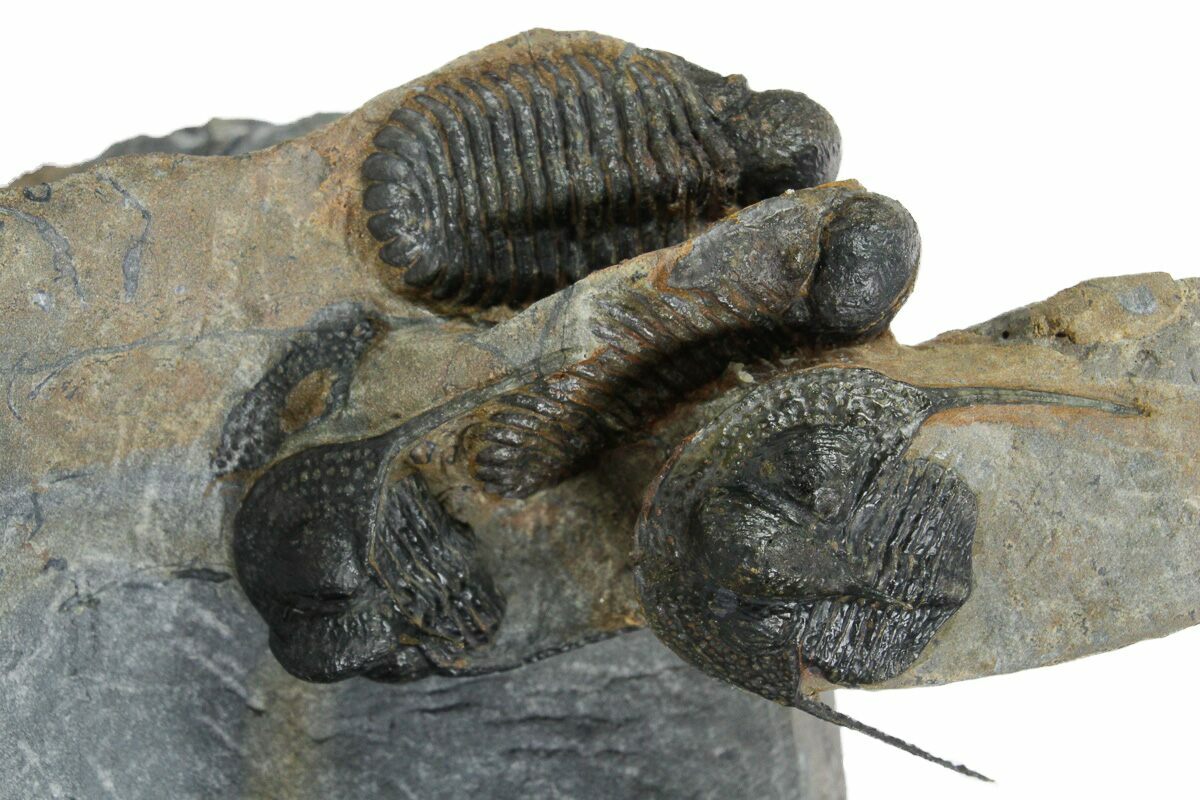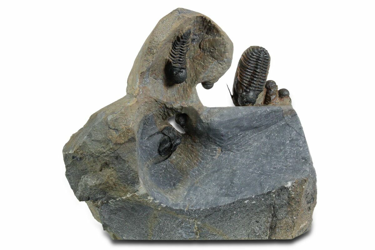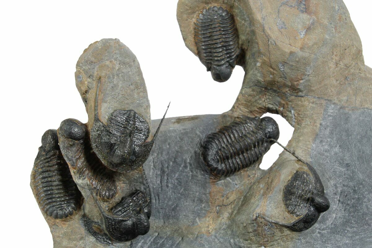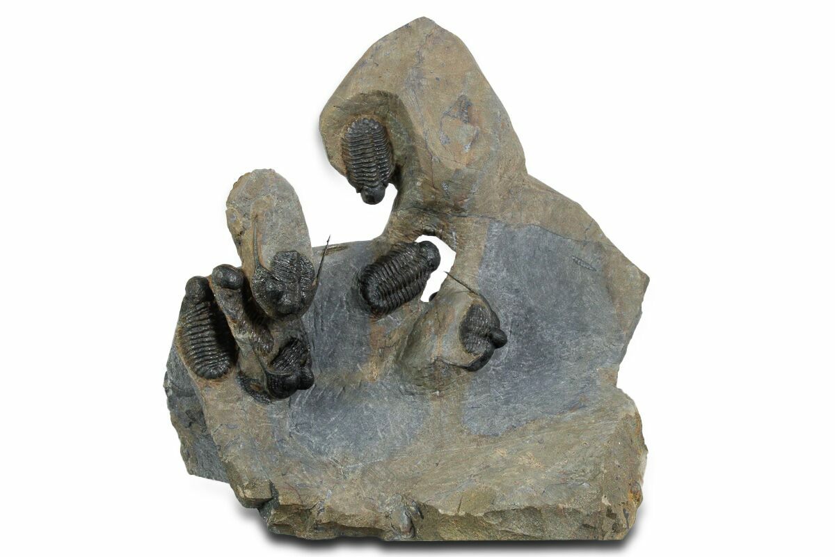 This is a cluster of five, rare Actinopeltis globosus trilobites associated with three Onnia superba. The surrounding limestone has been artistically sculpted to show of the trilobites well. There is about 5% shell restoration in total on this piece.