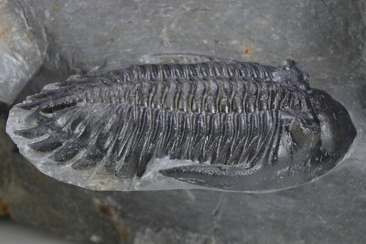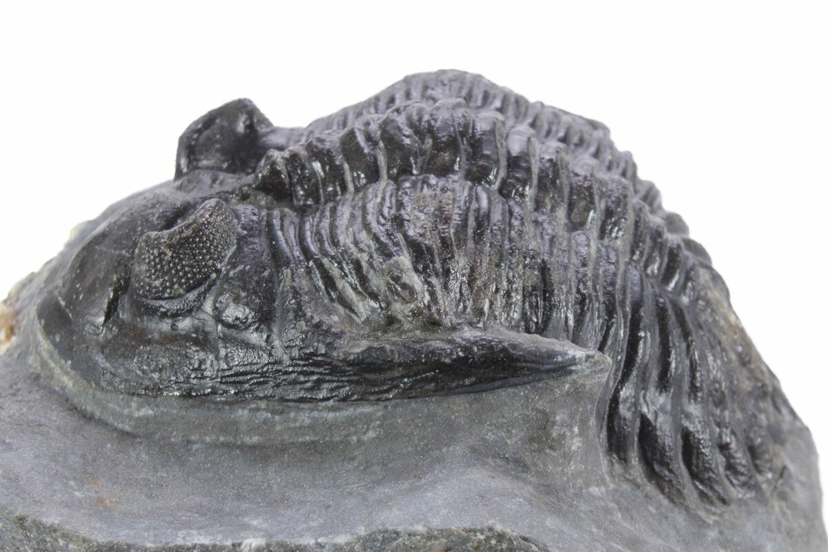 This is an artistically prepared cluster of three Hollardops trilobite fossils collected near Ofaten, Morocco. They are all naturally associated together and the hard limestone has been sculpted to present them in an aesthetic manner. Great detail on all of the specimens with preserved eye facets and only about 1% restoration overall.