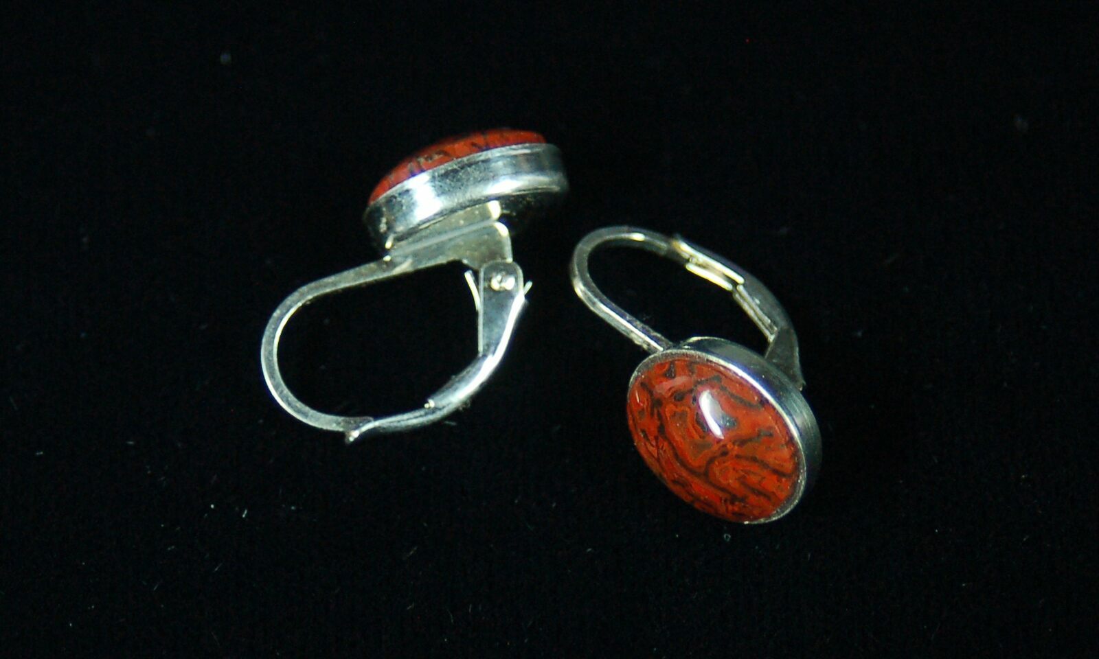 This is a pair of beautiful, dark red, earrings hand crafted from 150 million year old agatized dinosaur bone (gembone) by master stone craftsman, Kenneth Kolb. The amazingly agatized cell structure of the bone creates fantastic patterns when polished.