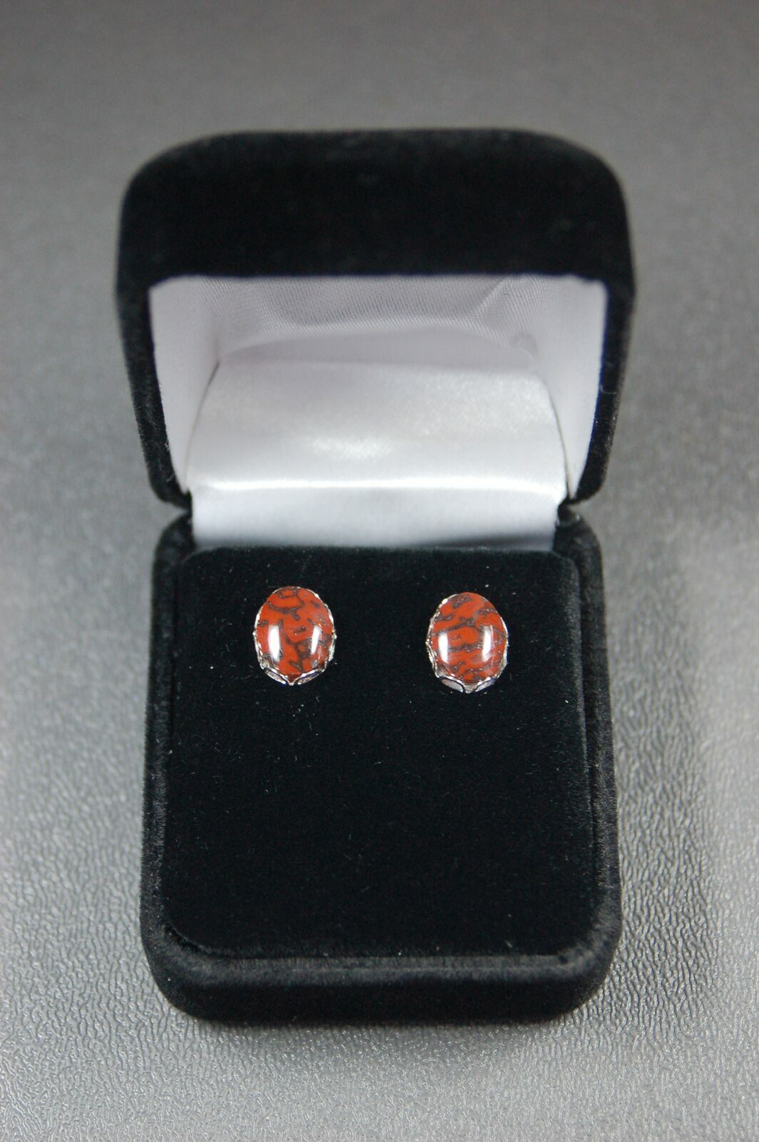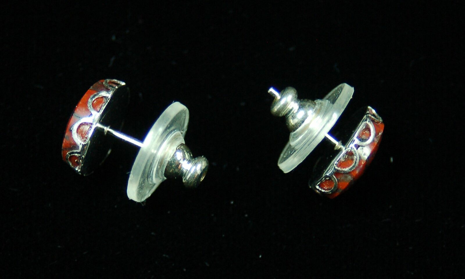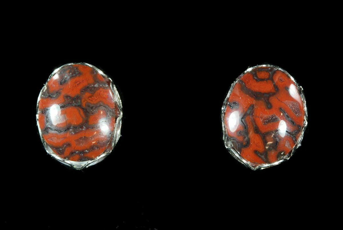 This is a pair of beautiful, dark red, earrings hand crafted from 150 million year old agatized dinosaur bone (gembone) by master stone craftsman, Kenneth Kolb. The amazingly agatized cell structure of the bone creates fantastic patterns when polished.