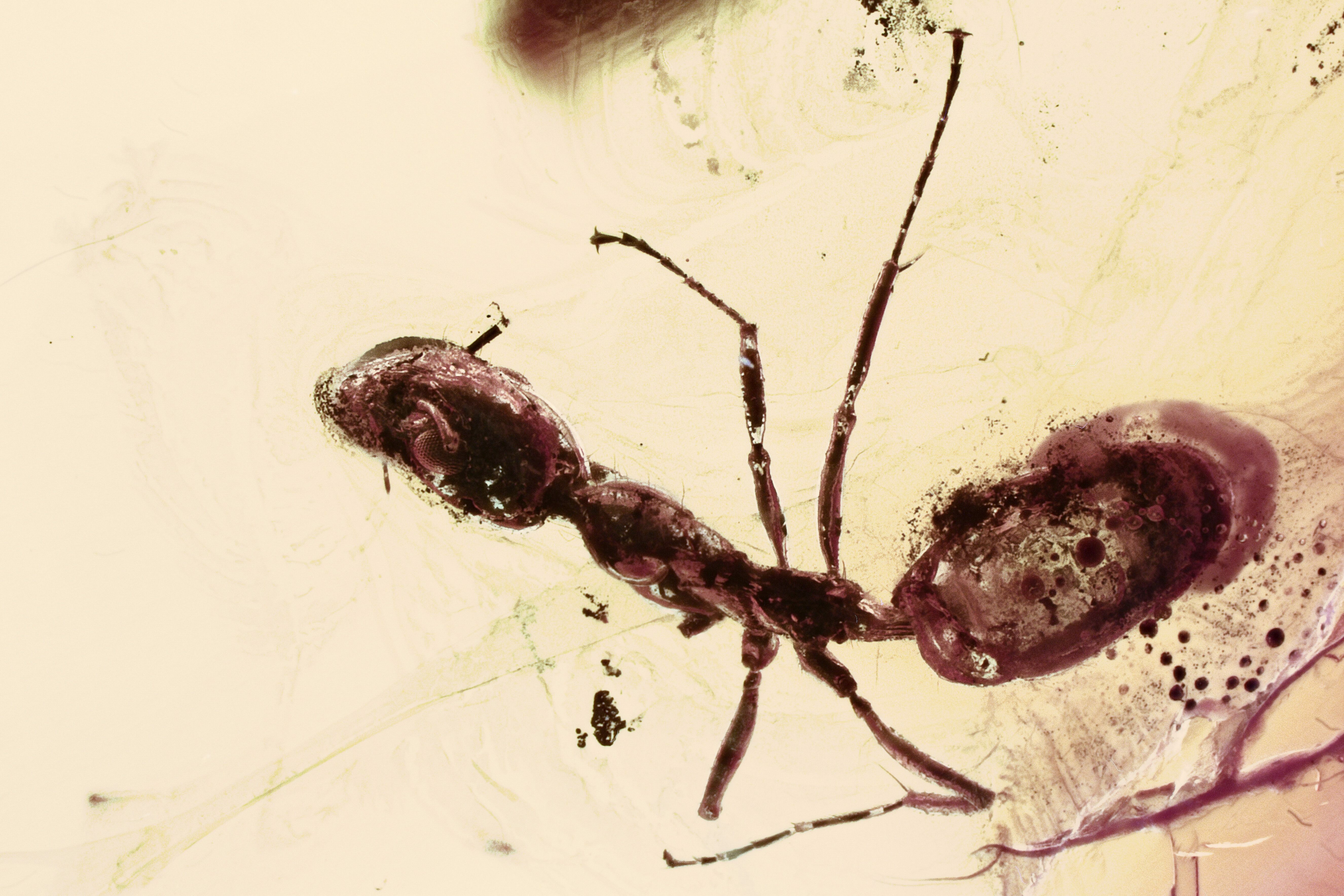 This is a detailed, 44 million year old fossil ant (family Formicidae) preserved in Baltic amber. The ant measures approximately 3.8mm long.