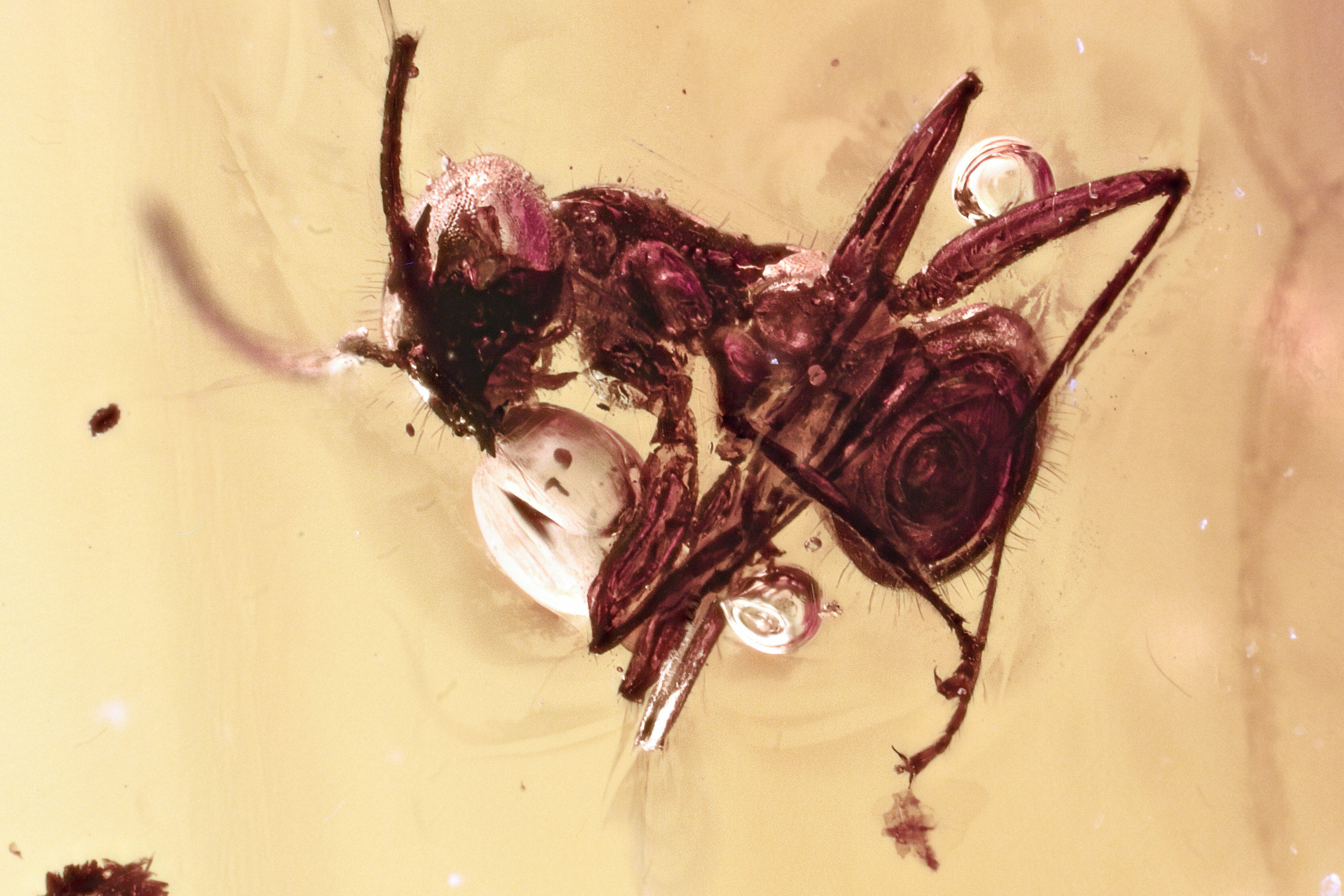 This is a detailed, 44 million year old fossil ant (family Formicidae) preserved in Baltic amber. The ant measures approximately 2.1mm wide including antennae.