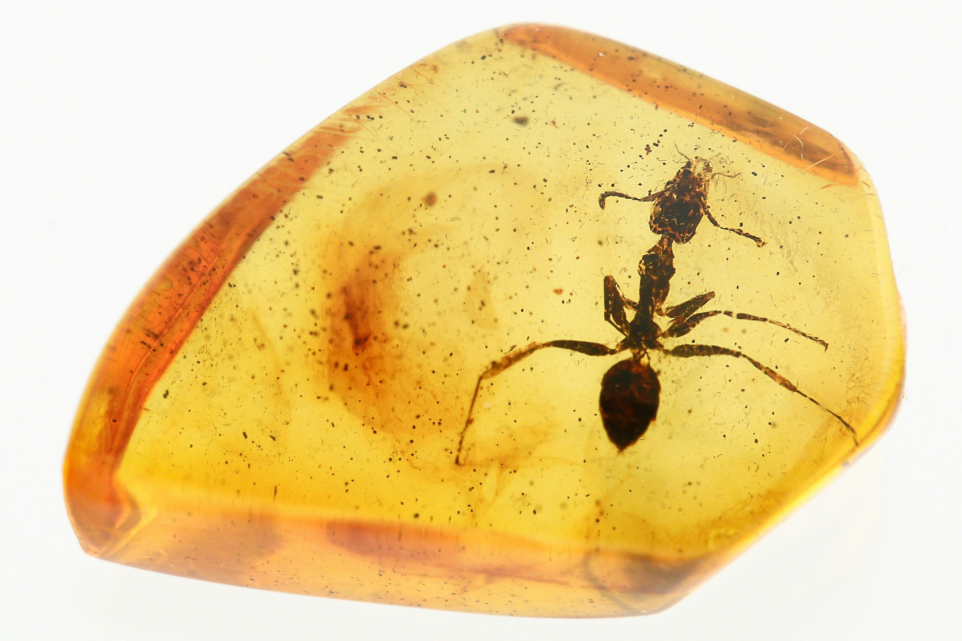 This is a detailed, 44 million year old fossil ant (Subfamily Formicinae - genus Gesomyrmex) preserved in Baltic amber. The legspan of the ant is about 6.2mm in a 14 x 9.5 x 5mm piece of amber.