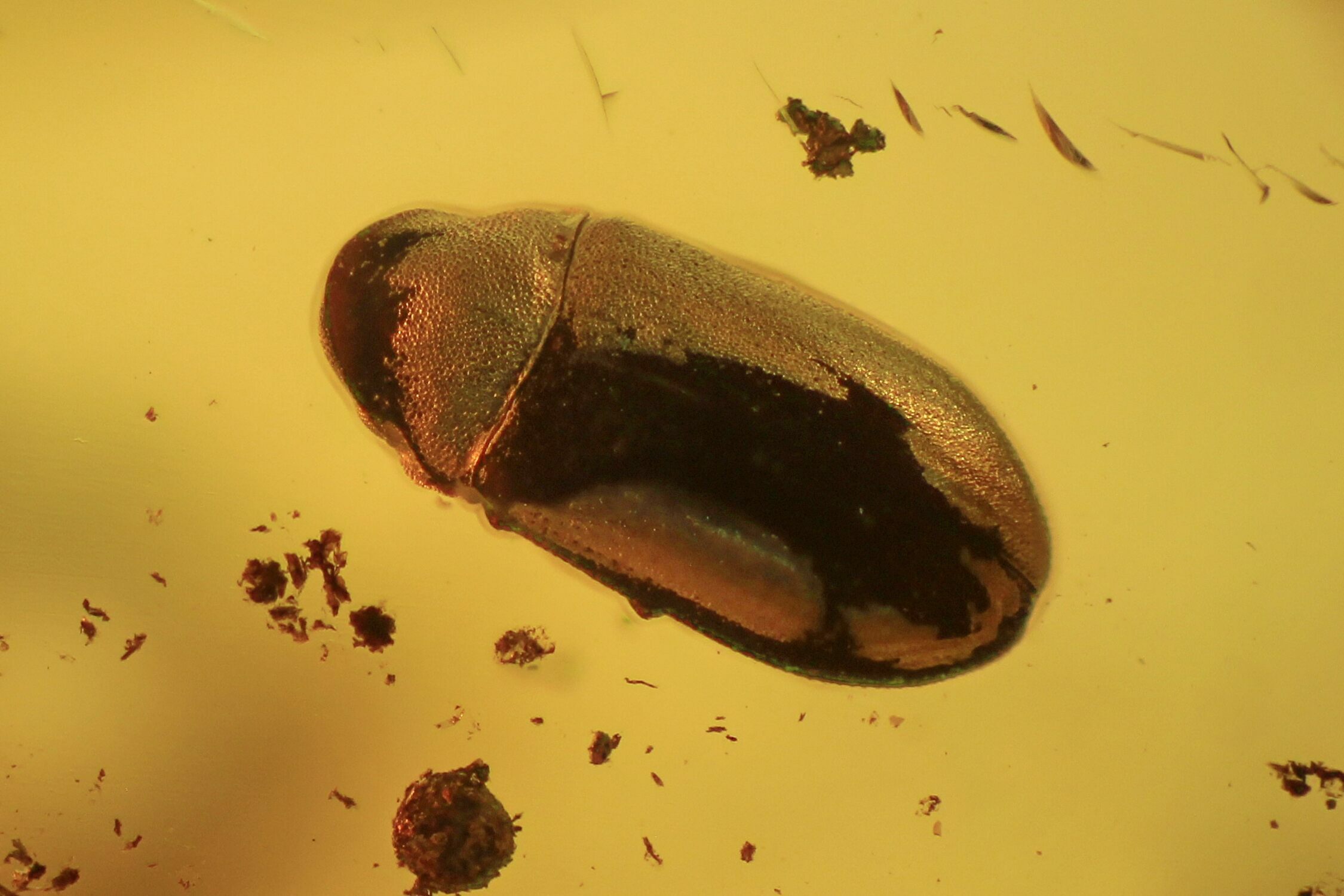 This is a small but detailed, 44 million year old fossil beetle (order Coleoptera) preserved in Baltic amber. This beetle is about 2mm long