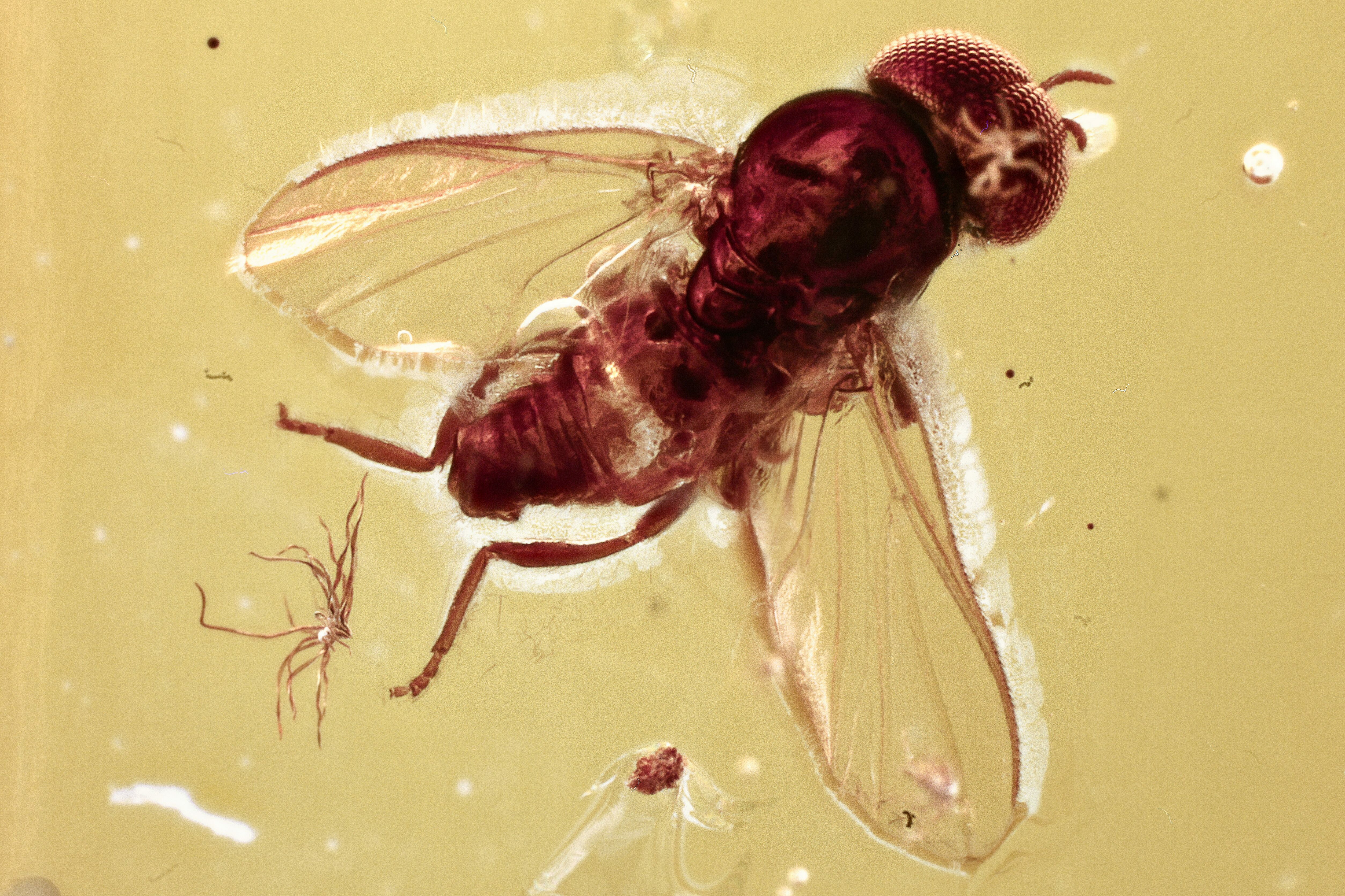 This is a small but detailed, 44 million year old fossil black fly (order Diptera - family Simuliidae) preserved in Baltic amber. It measures about 2mm long including appendages and wings.