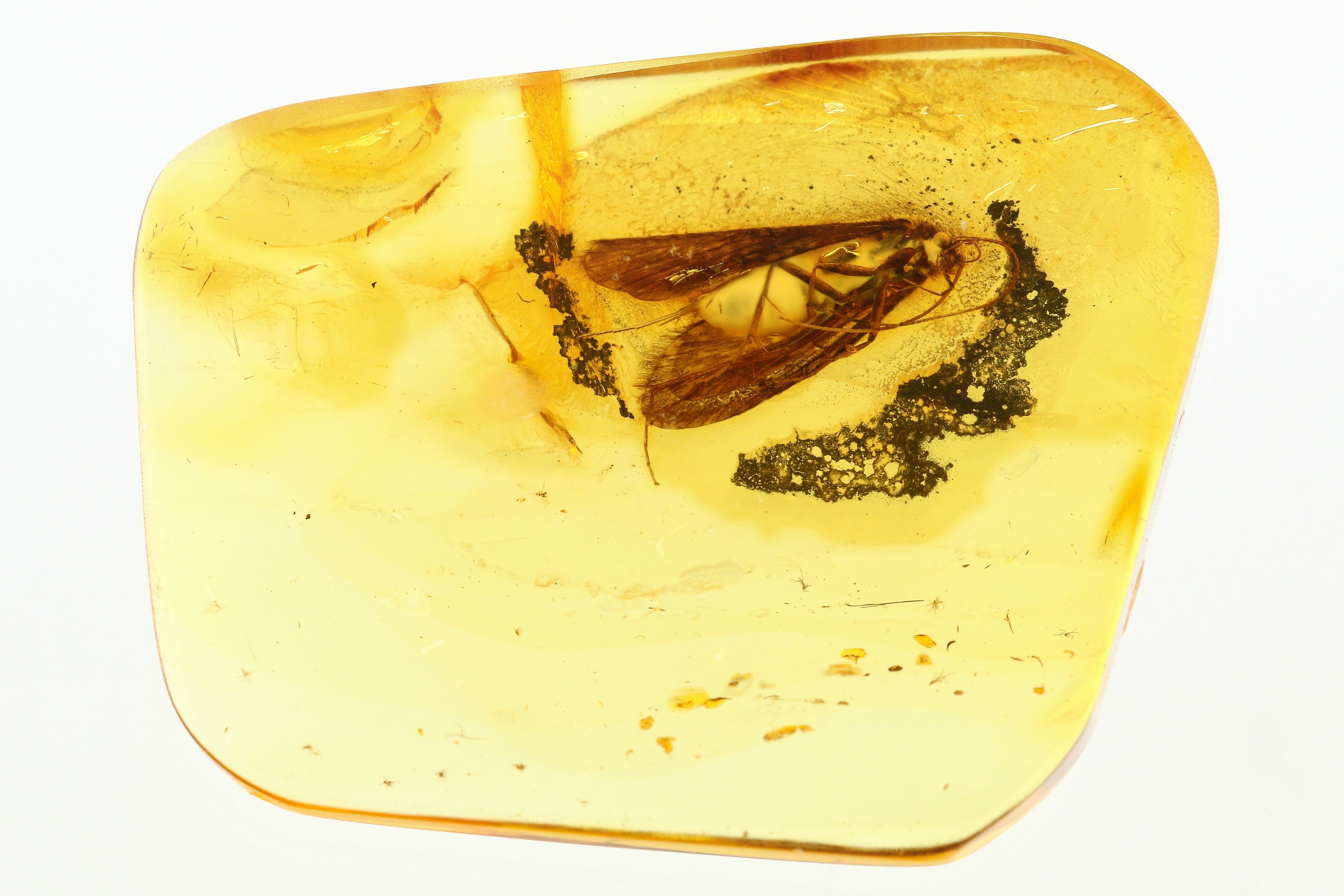 This is a beautifully detailed, 44 million year old fossil caddisfly (order Trichoptera) preserved in Baltic amber. The length of this caddisfly is about 9.5mm.