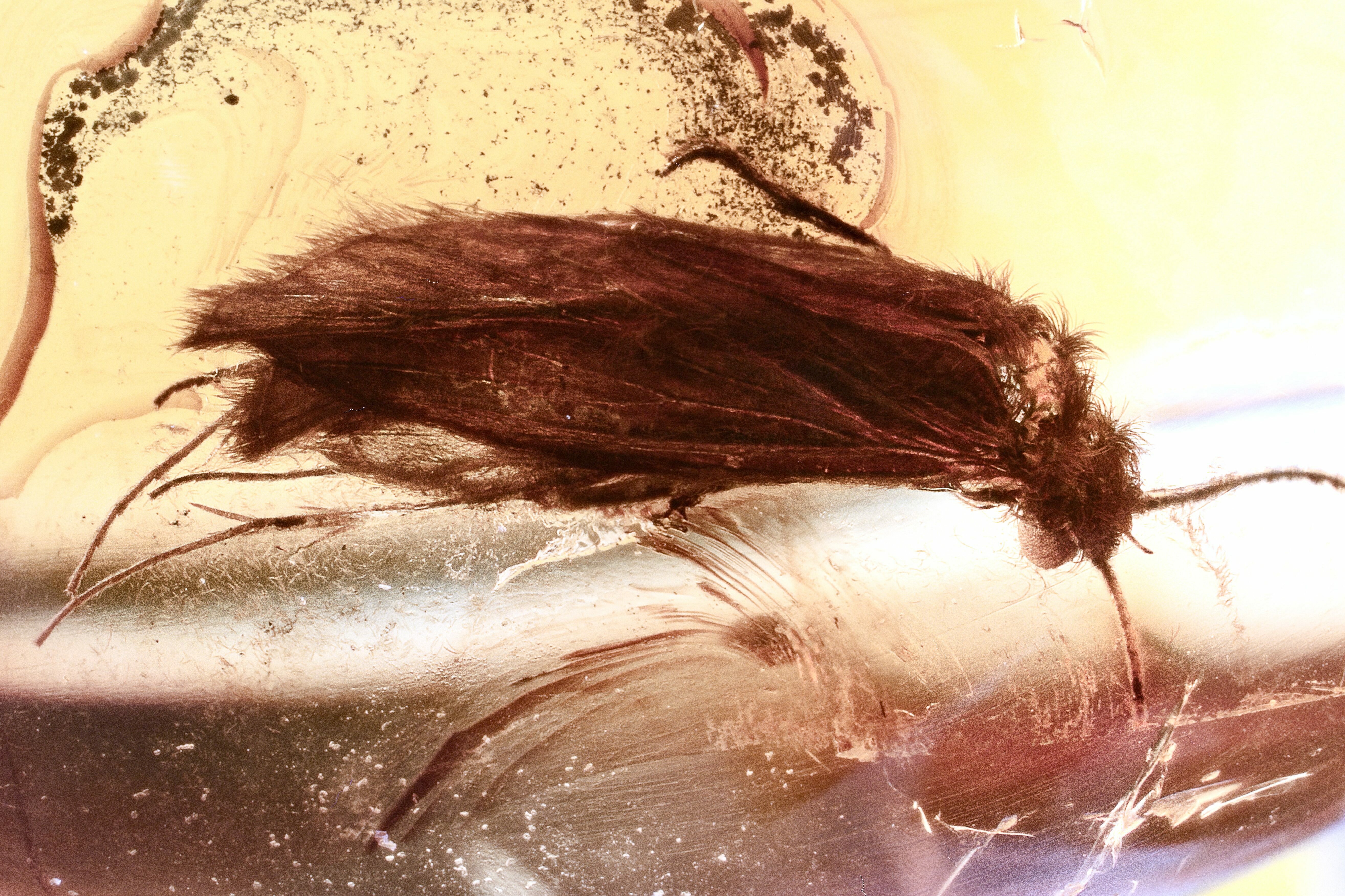 This is a detailed, 44 million year old fossil caddisfly (order Trichoptera) preserved in a piece of Baltic amber. The length of this caddisfly is about 6.8mm including appendages and antennae.