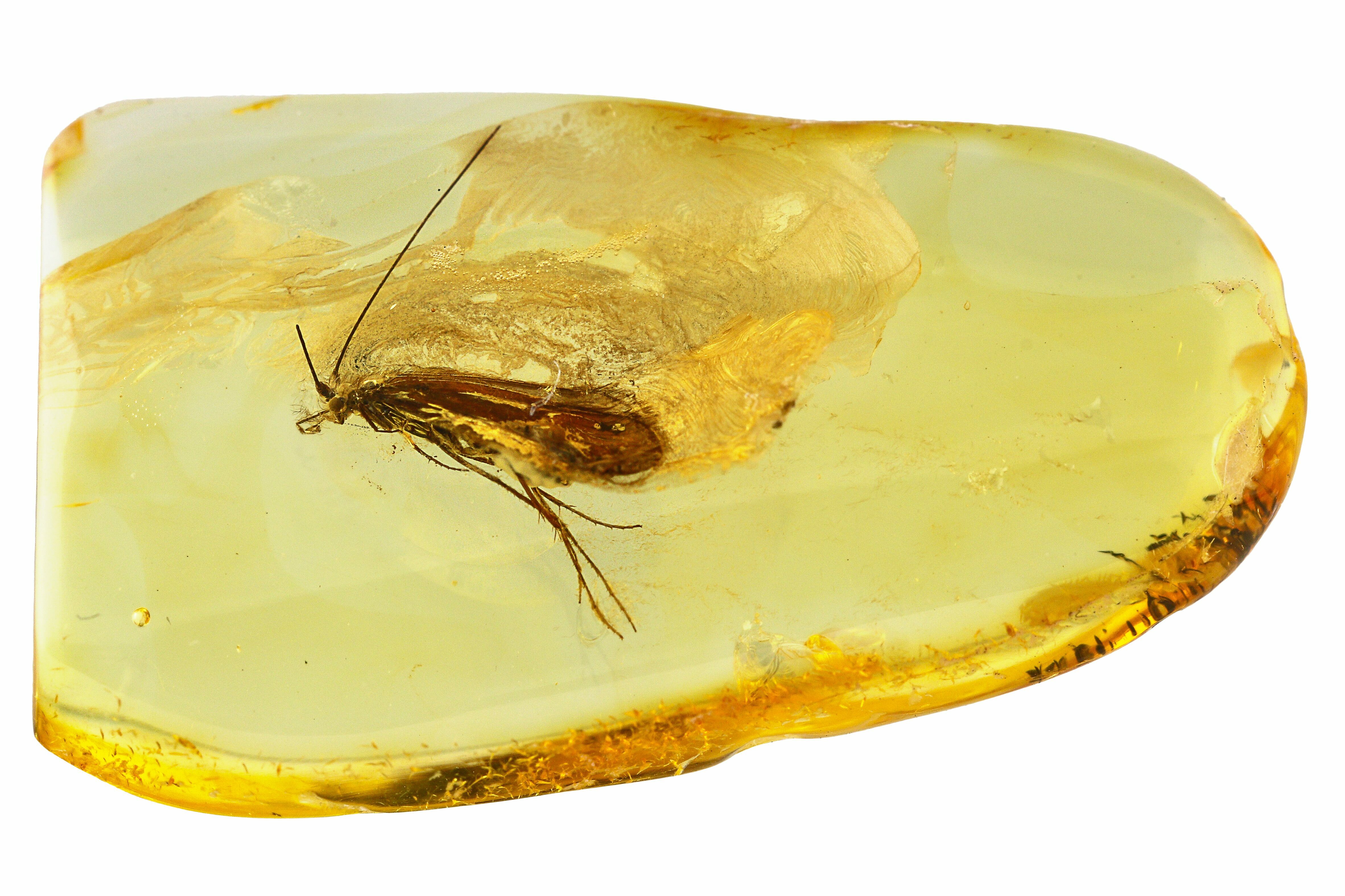 This is a beautifully detailed, 44 million year old fossil caddisfly (order Trichoptera) preserved in a piece of Baltic amber. The length of this caddisfly is about 9mm including appendages.