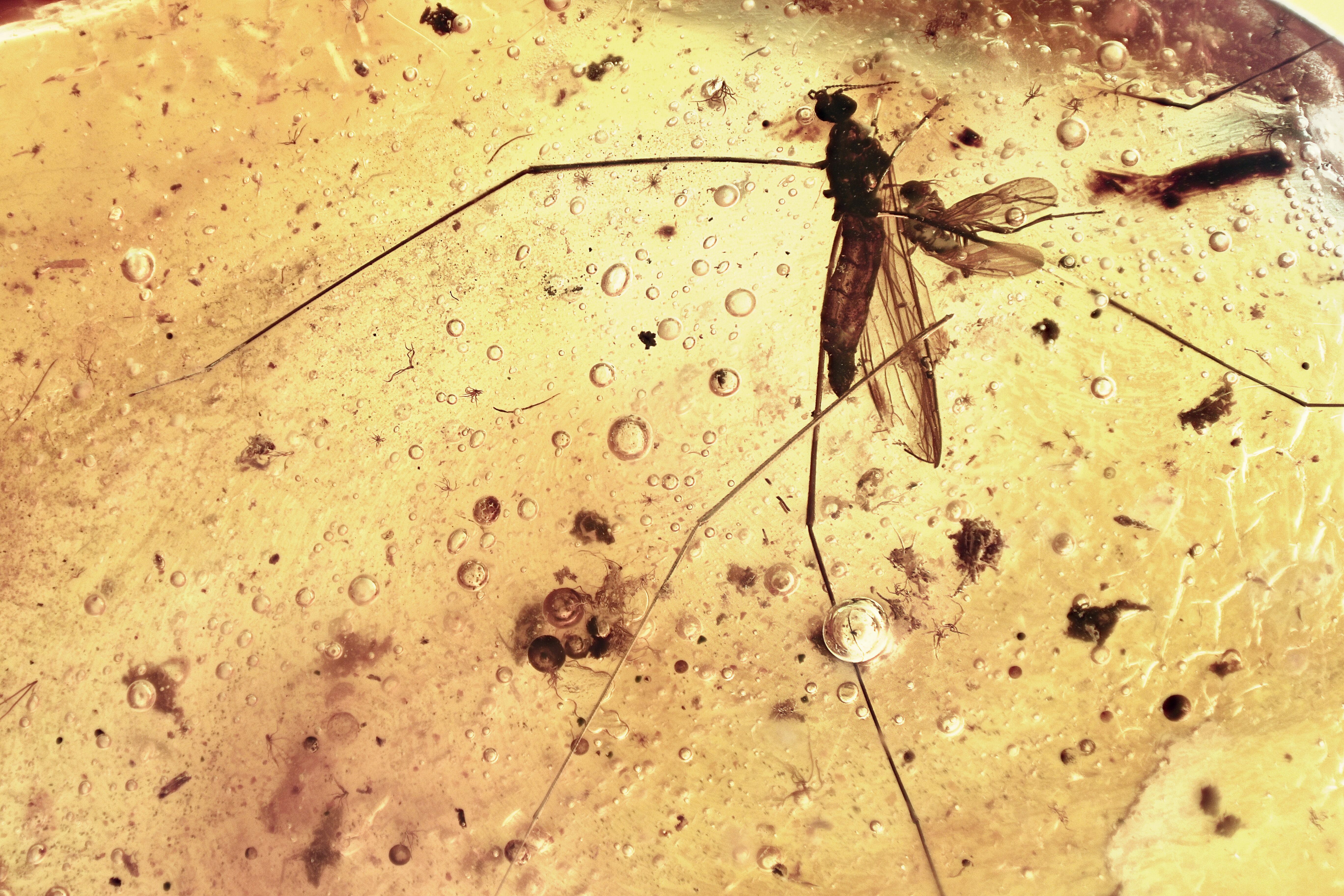 This piece of 44 million year old Baltic amber contains a nicely preserved crane fly from the subfamily Limoniidae preserved alongside a dagger fly (family Empididae). The crane fly measures approximately 13mm (including legs) long.