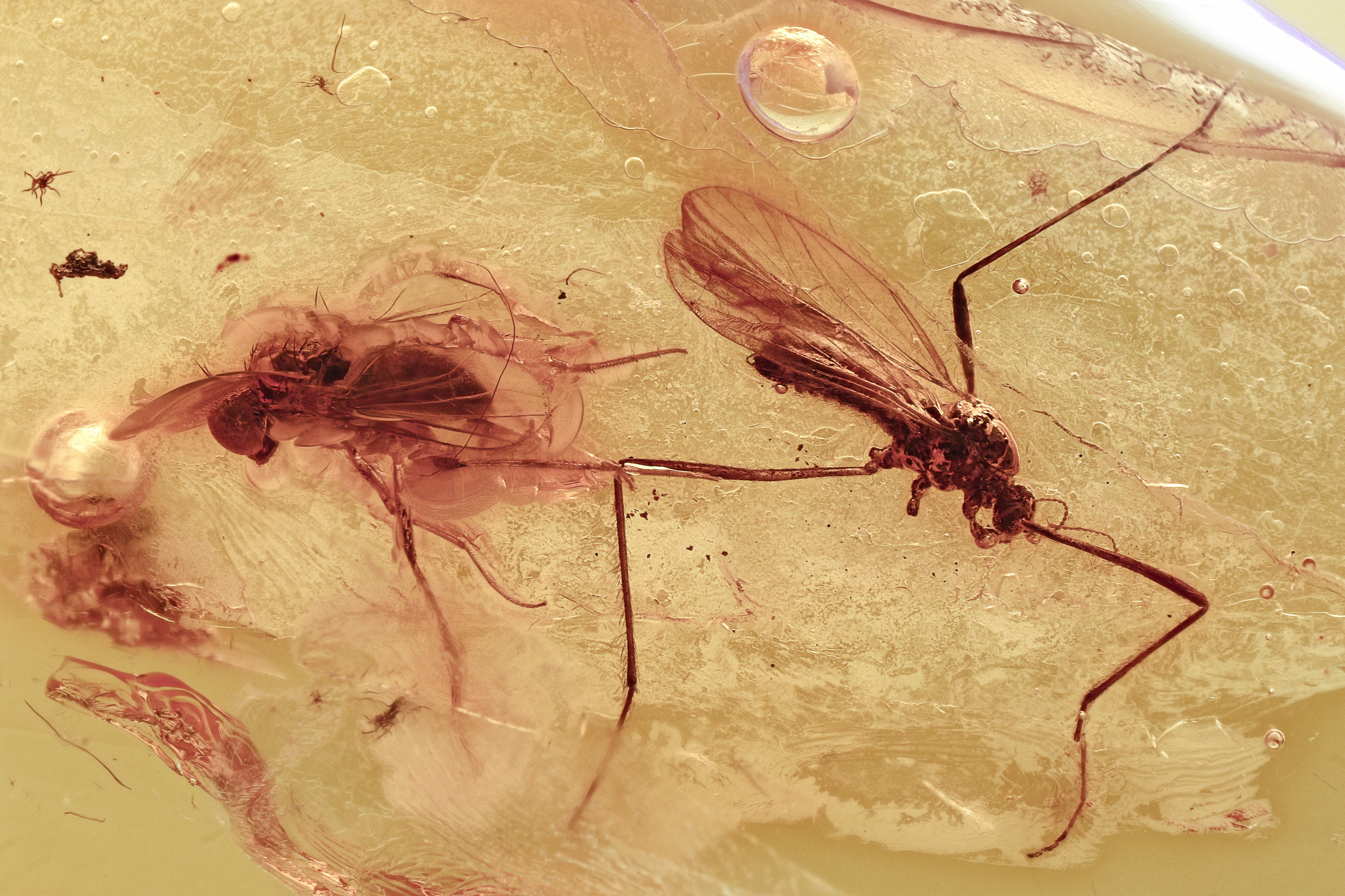 Detailed Fossil Crane Fly and Long-Legged Fly in Baltic Amber