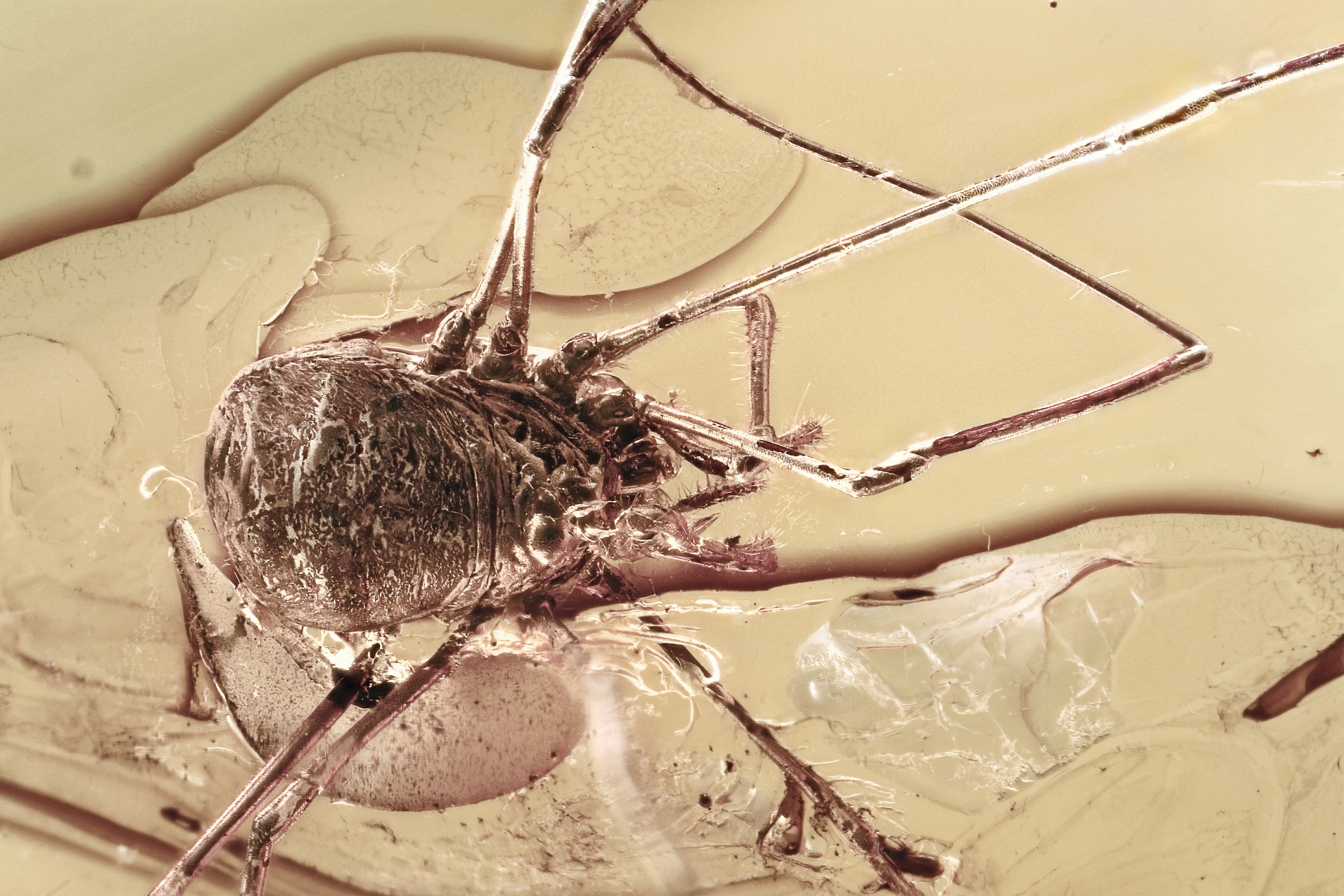 This is a detailed, 44 million year old fossil daddy long-leg spider (a.k.a. harvestmen spider - order Opiliones) preserved in Baltic amber. Including the legs the arachnid measures about 14mm wide.