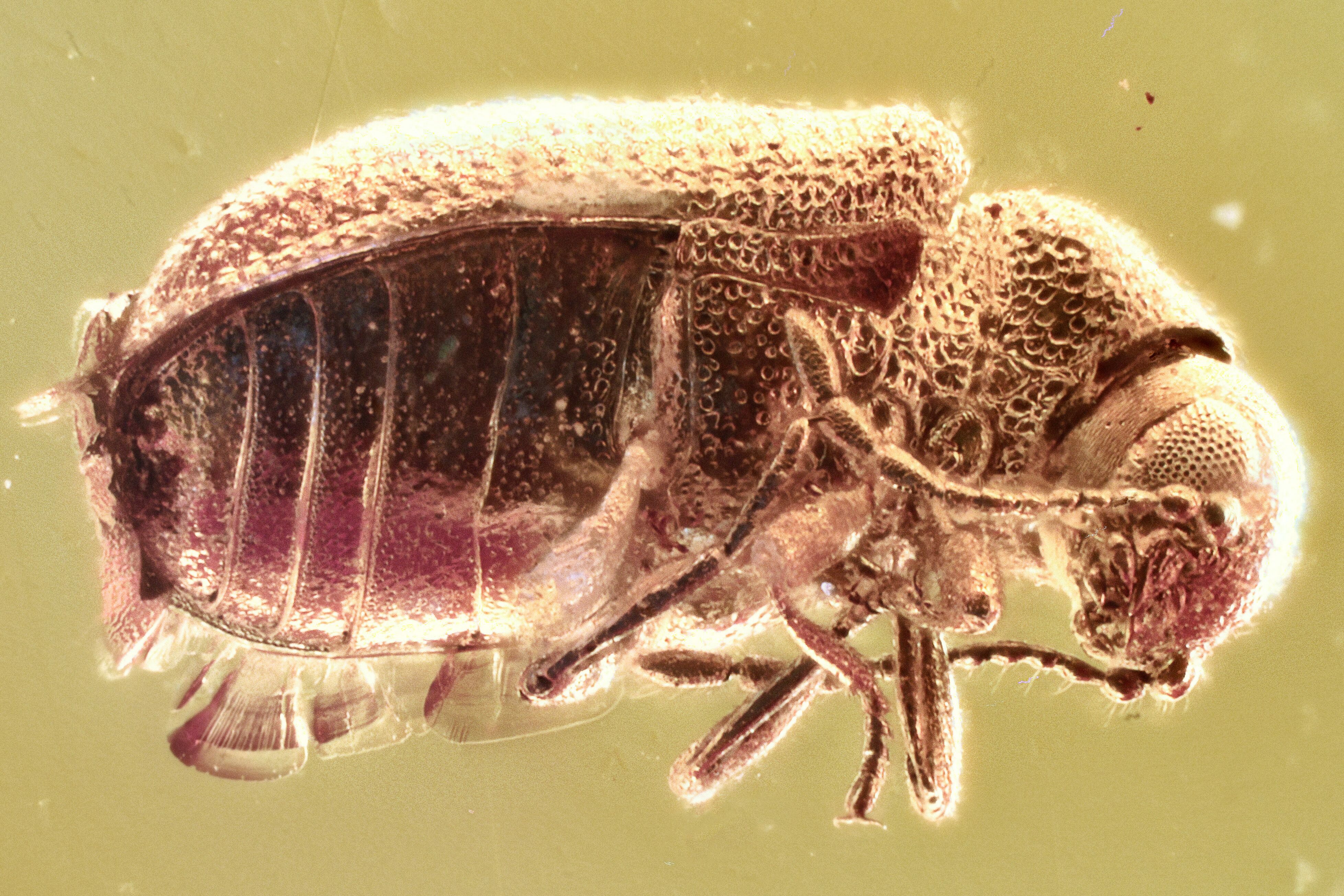 This is a detailed, 44 million year old fossil death-watch beetle (order Coleoptera - family Ptinidae - subfamily Dryophilinae) preserved in Baltic amber. This beetle is about 1.7mm long.