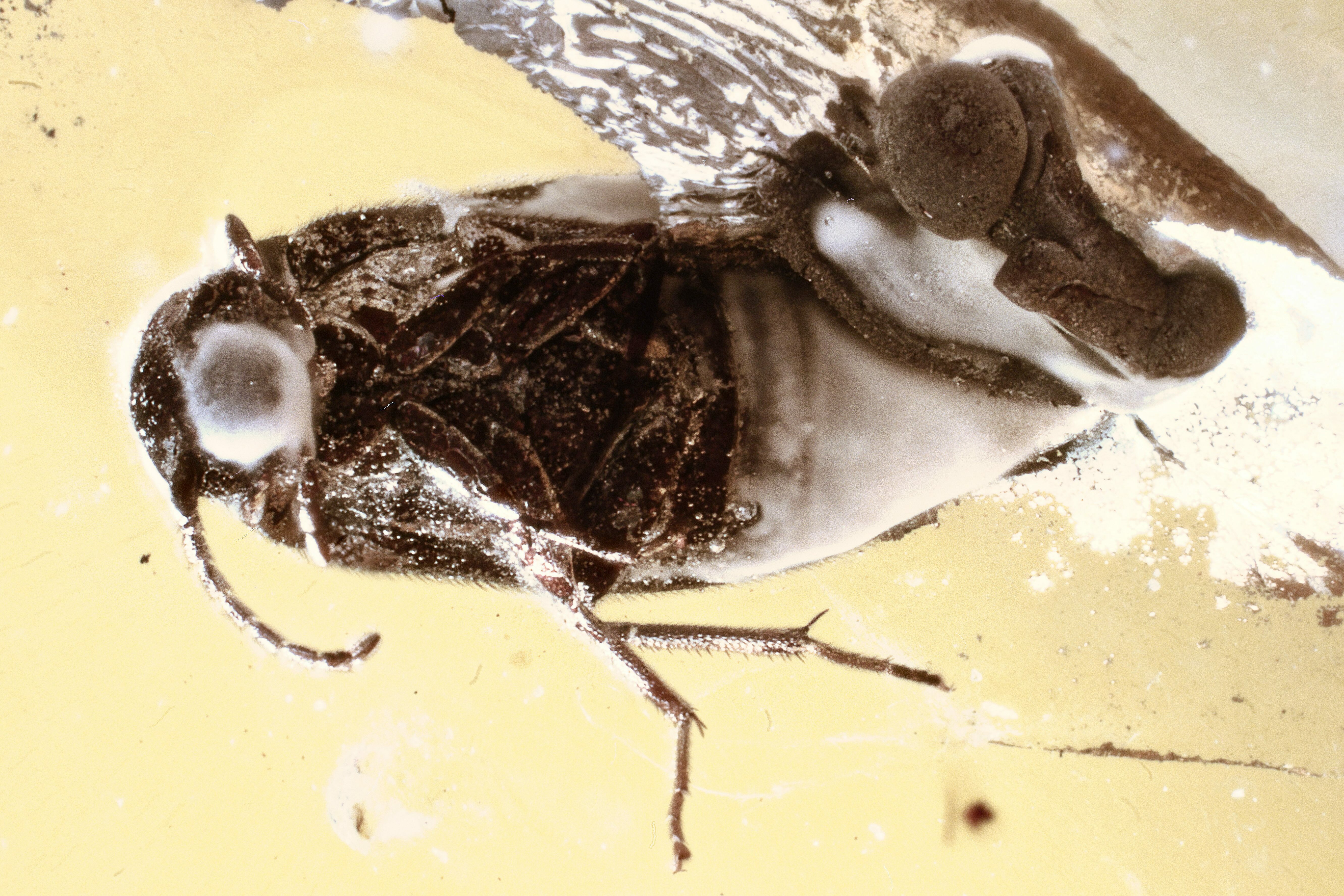 This is a 44 million year old fossil false flower beetle (order Coleoptera - family Scraptiidae) preserved in Baltic amber. This beetle is about 2.2mm long.
