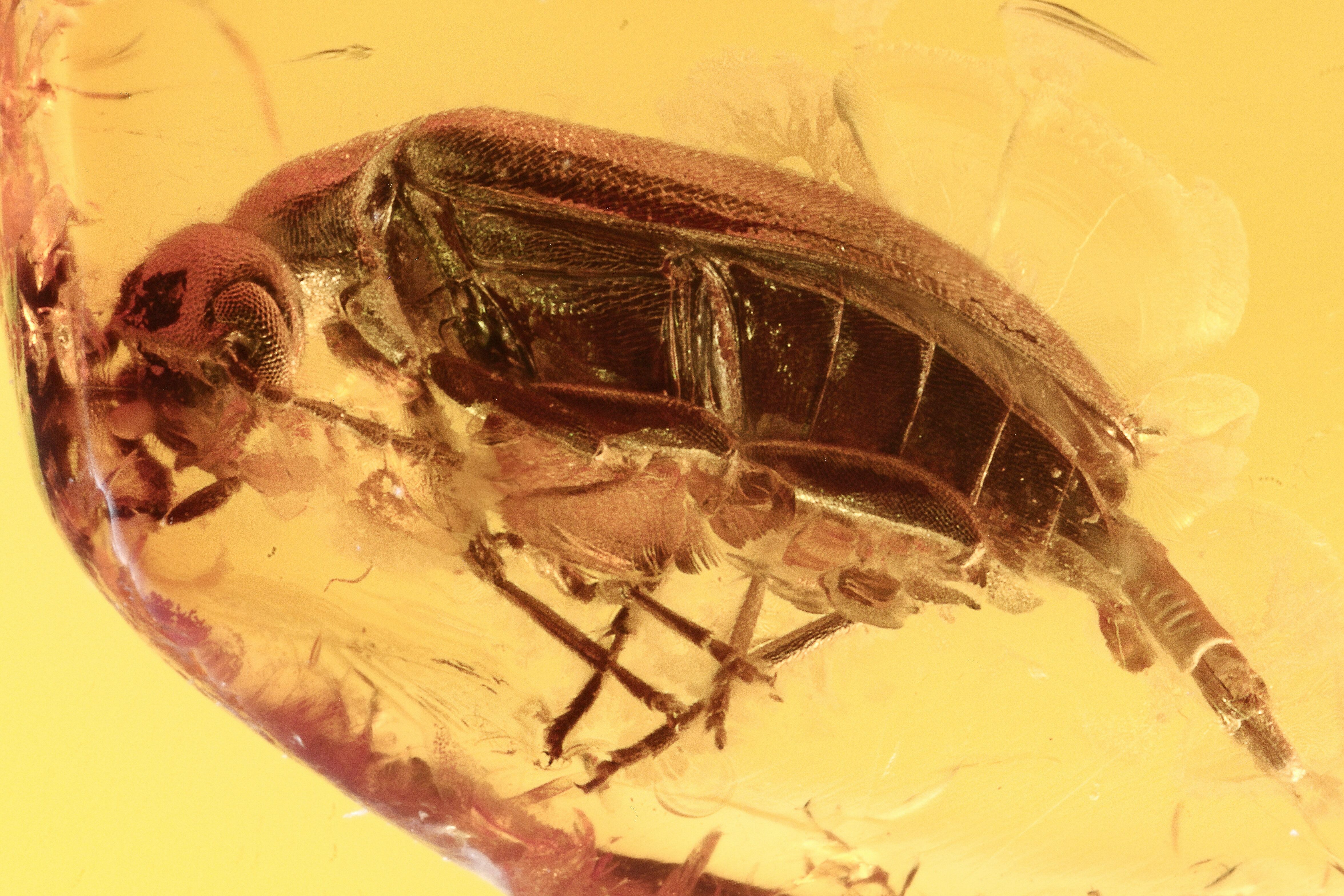 This is a 44 million year old fossil false flower beetle (order Coleoptera - family Scraptiidae) preserved in Baltic amber. This beetle is about 5mm long.