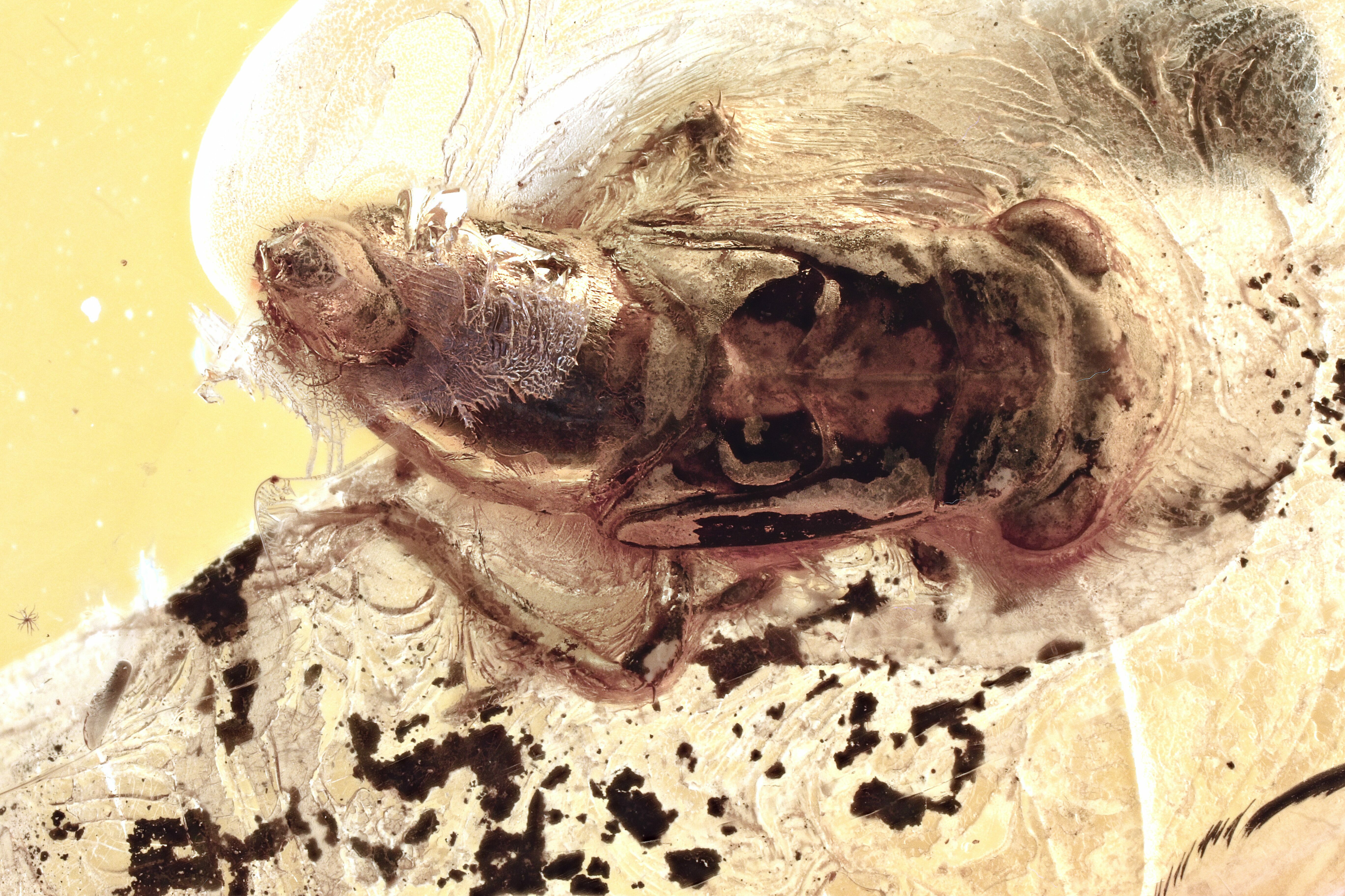 This 44 million year old piece of Baltic amber contains a beautifully detailed fossil froghopper (order Hemiptera - superfamily Cercopoidea). The length of this insect is about 5.2mm.