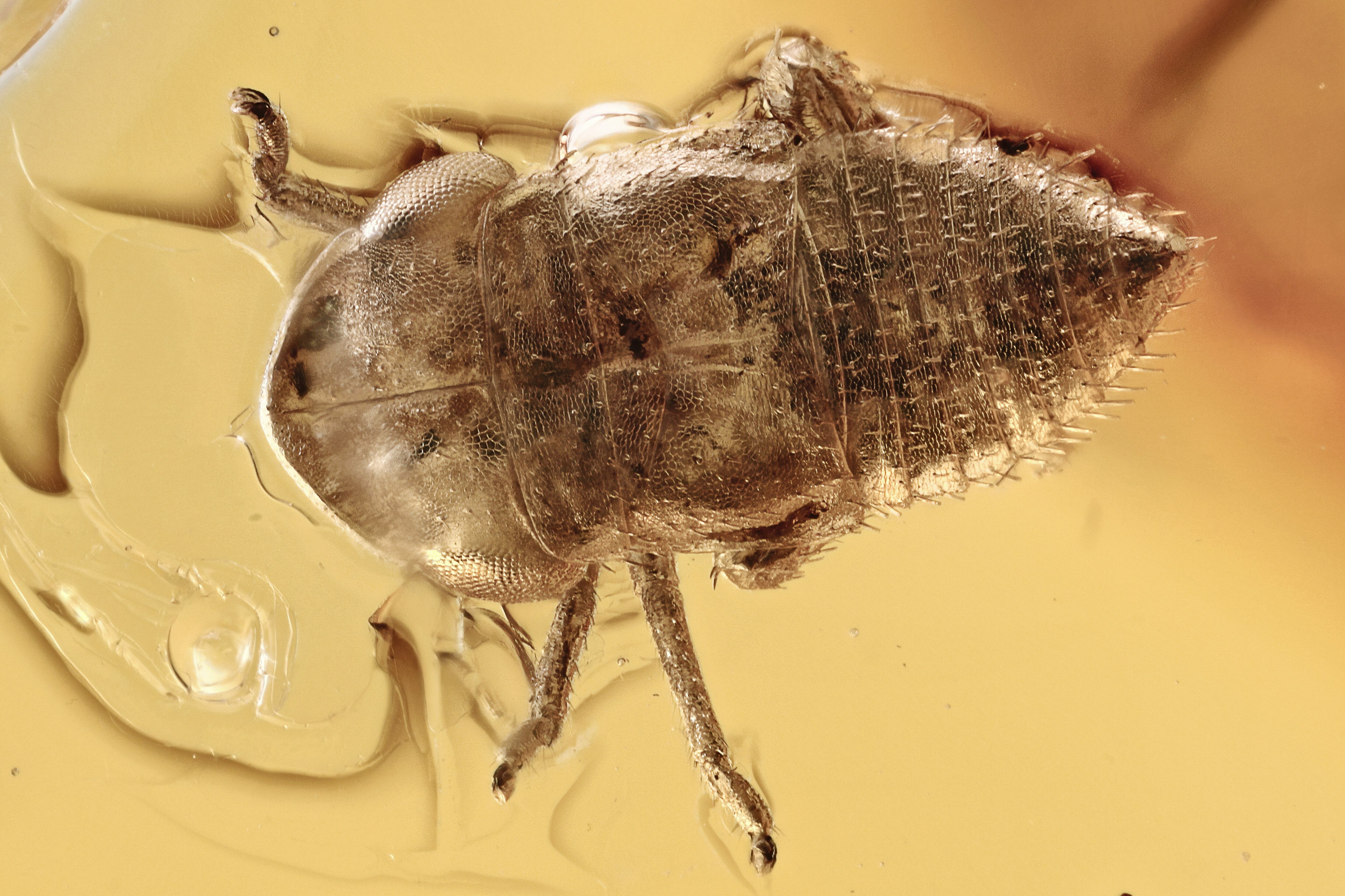 This 44 million year old piece of Baltic amber contains a beautifully detailed fossil froghopper (order Hemiptera - superfamily Cercopoidea) nymph. The length of this insect is about 1.9mm.