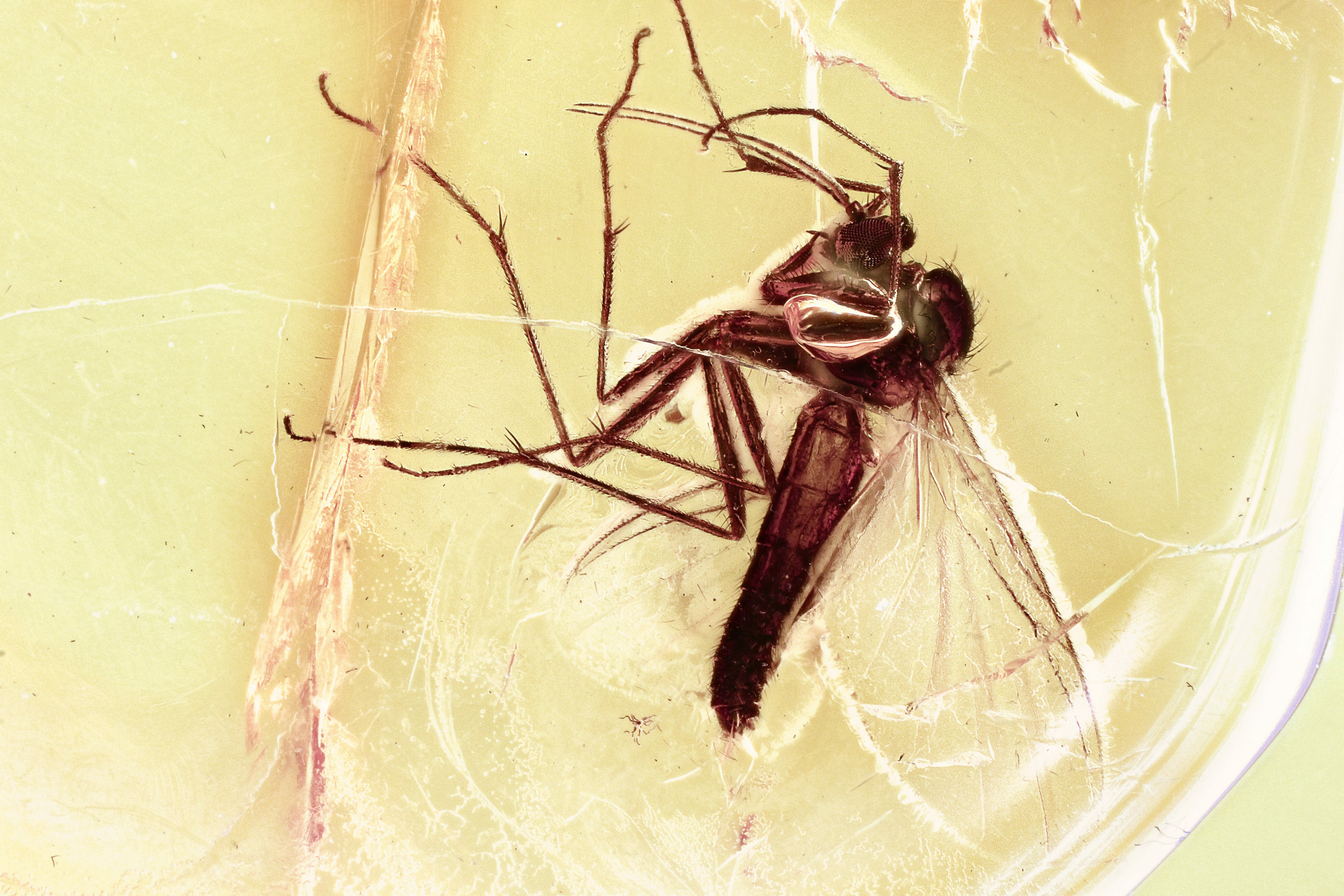 This is a beautifully detailed, 44 million year old fossil fungus gnat (order Diptera - family Mycetophilidae) preserved in Baltic amber. The length of the gnat is about 5.8mm including appendages and wings.