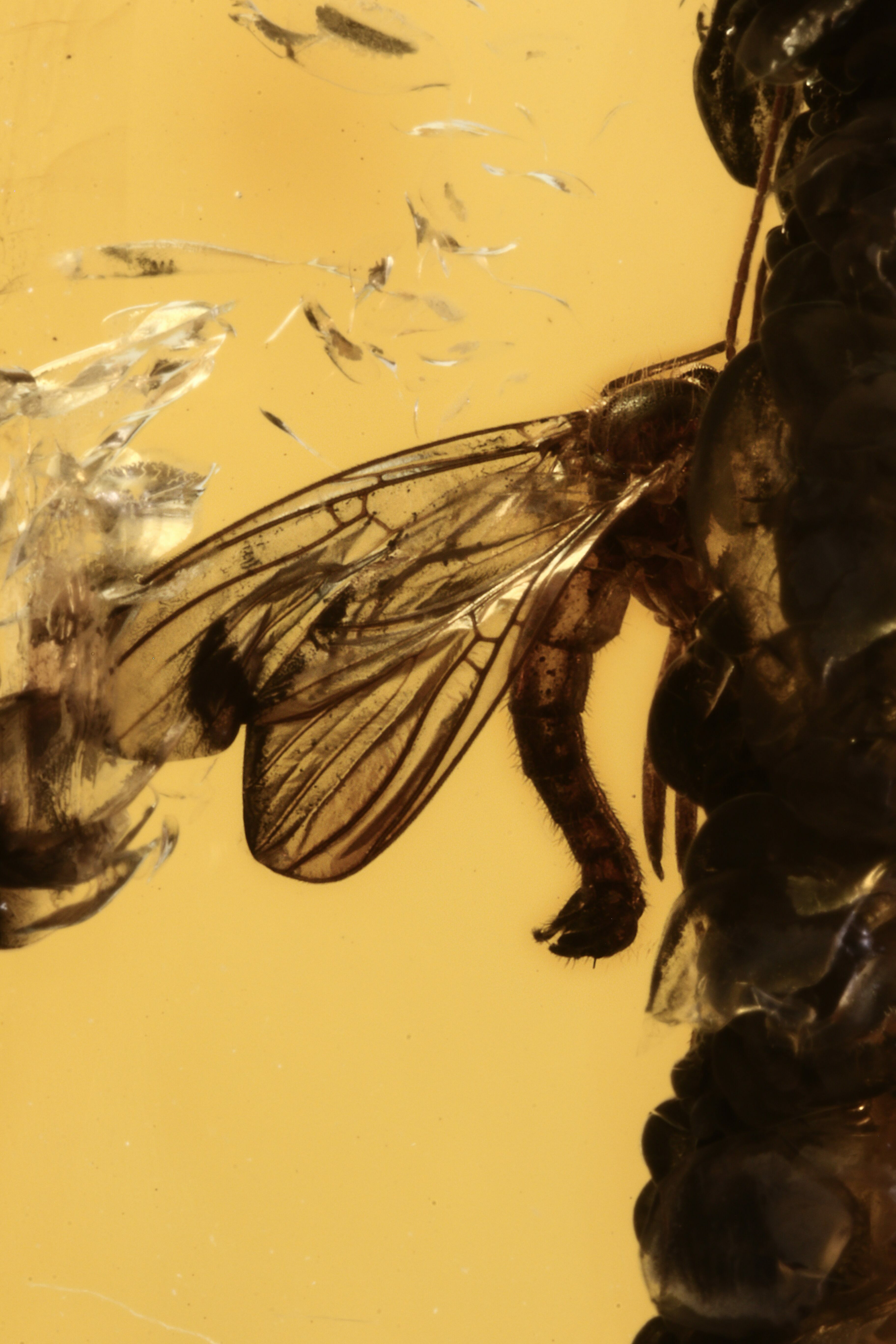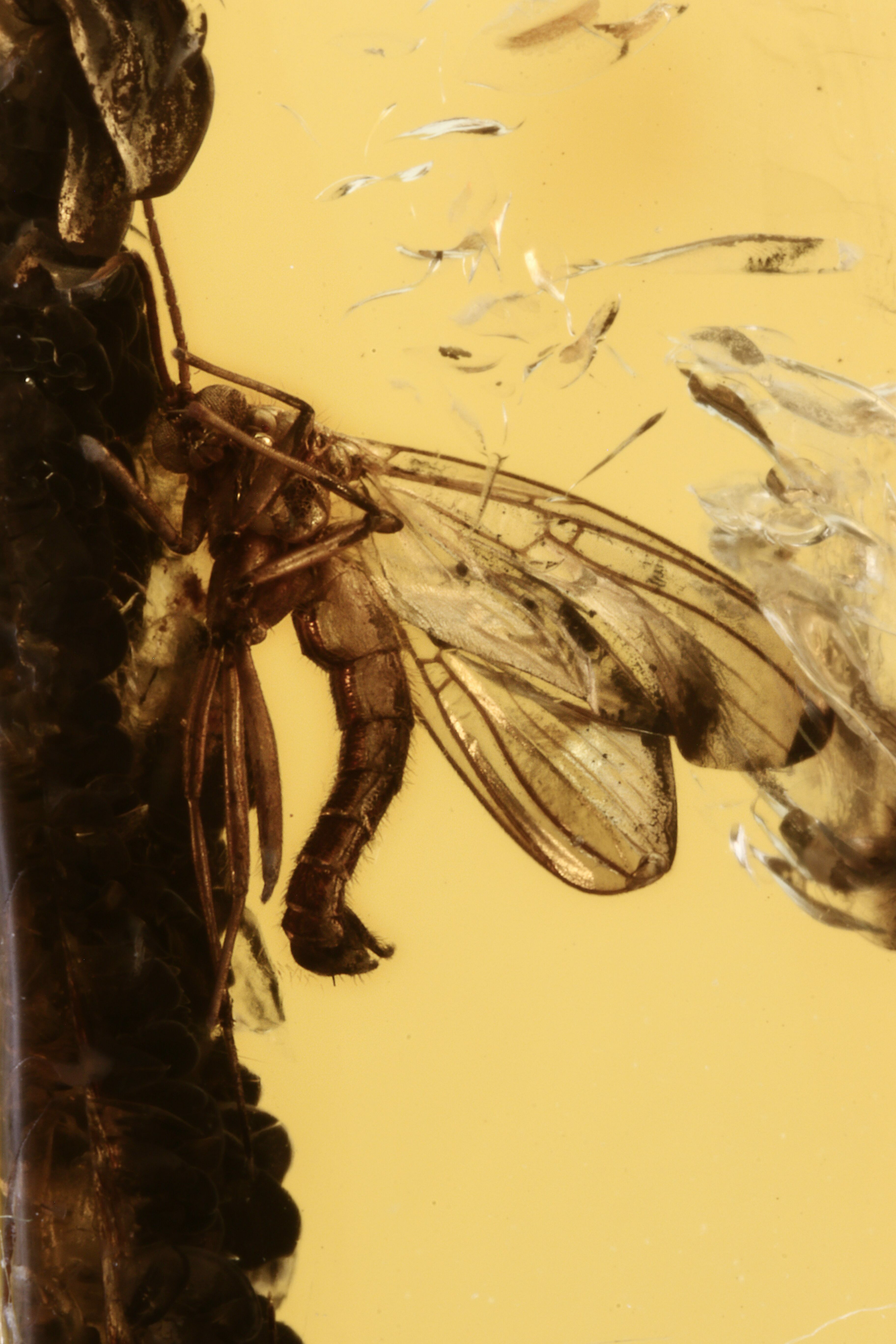 This is a amazingly detailed, 44 million year old fossil fungus gnat (order Diptera - family Mycetophilidae) preserved in Baltic Amber. The gnat is about 5mm in length has unusual, well-preserved genitalia.