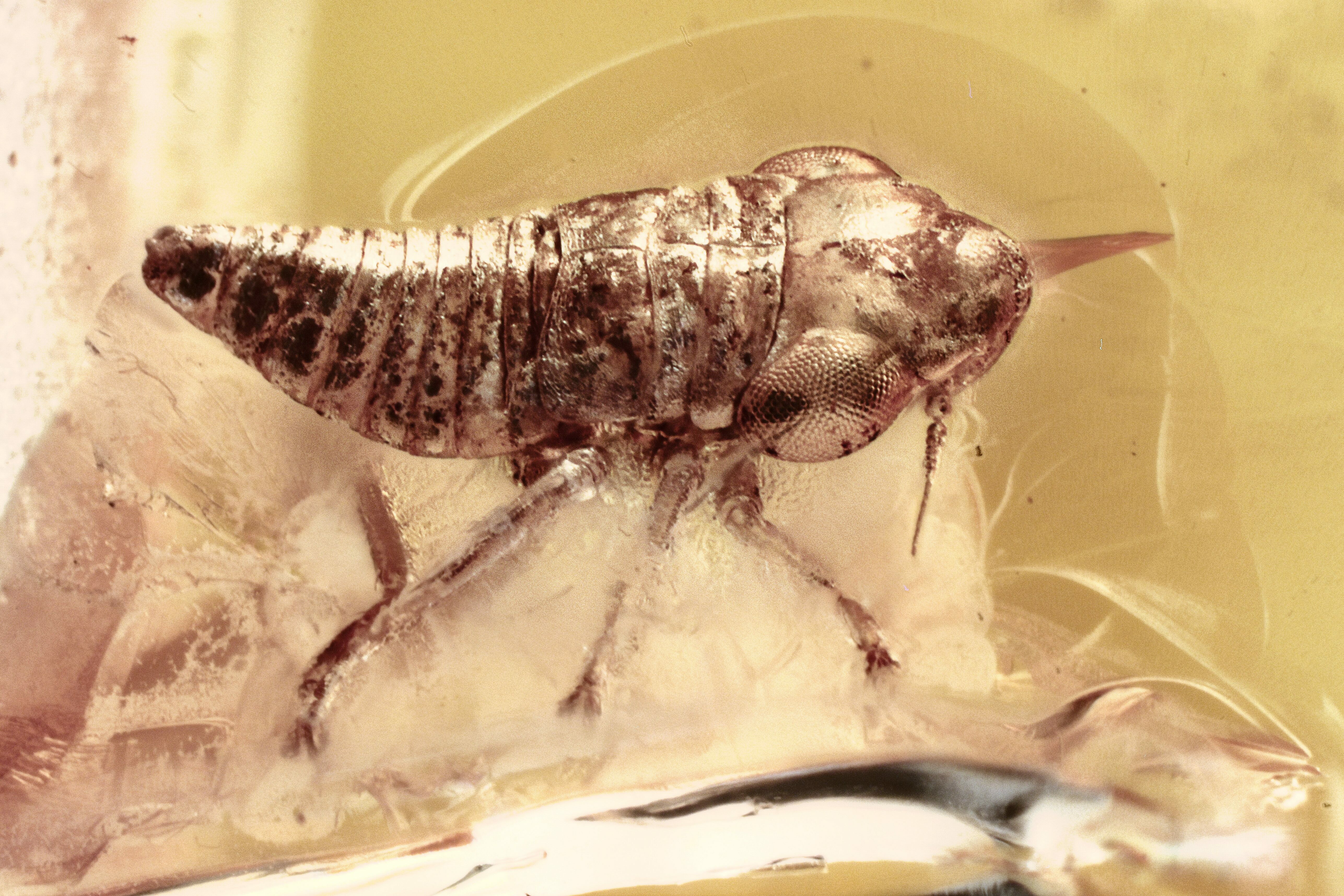 This is a detailed, 44 million year old fossil leafhopper (family Cicadellidae) preserved alongside a true midge (family Chironomidae) in Baltic amber.