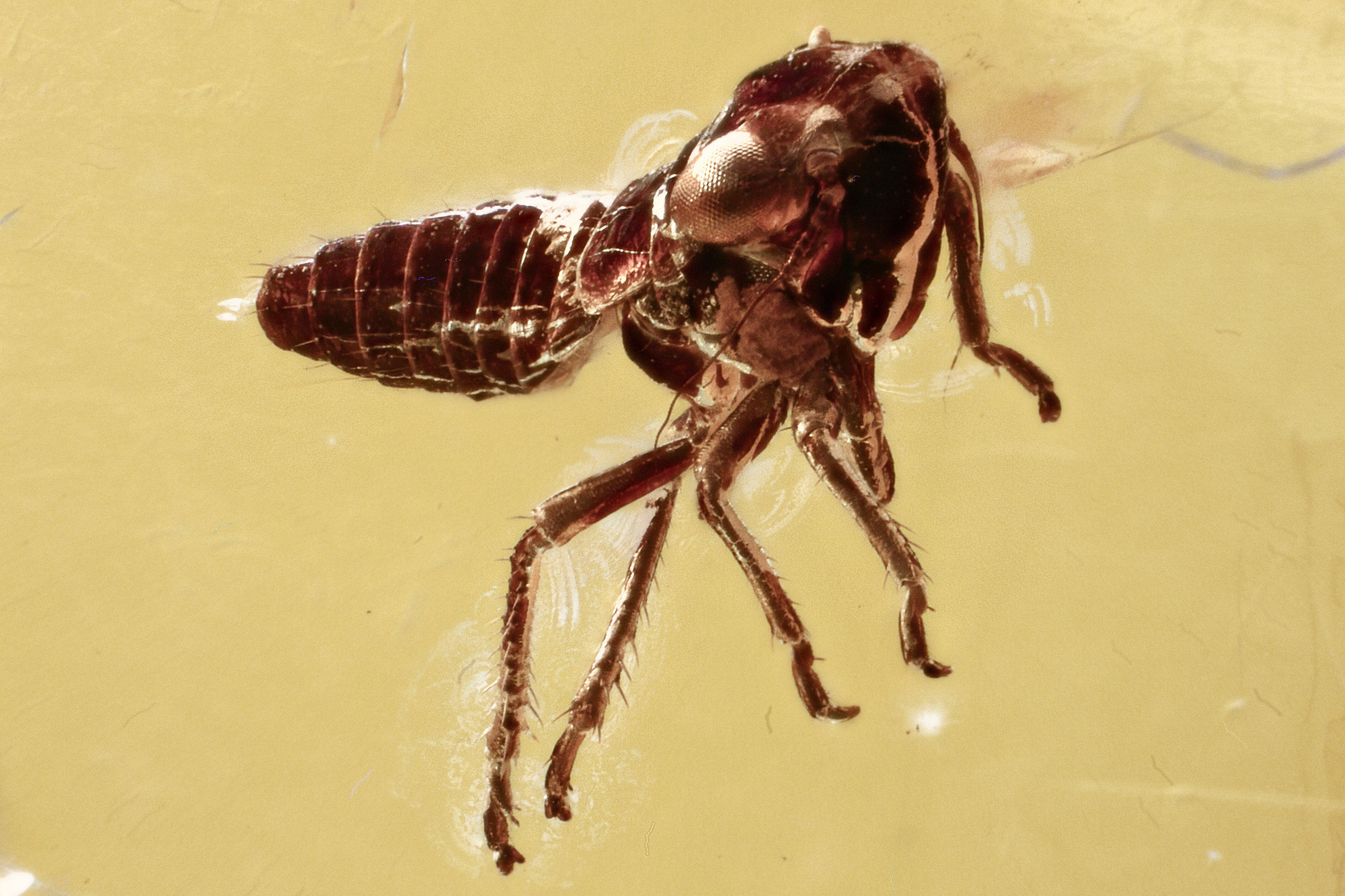This is a detailed, 44 million year old fossil leafhopper (family Cicadellidae) preserved in Baltic amber. The length of the insect is about 2mm in a 15 x 12 x 5mm piece of amber.