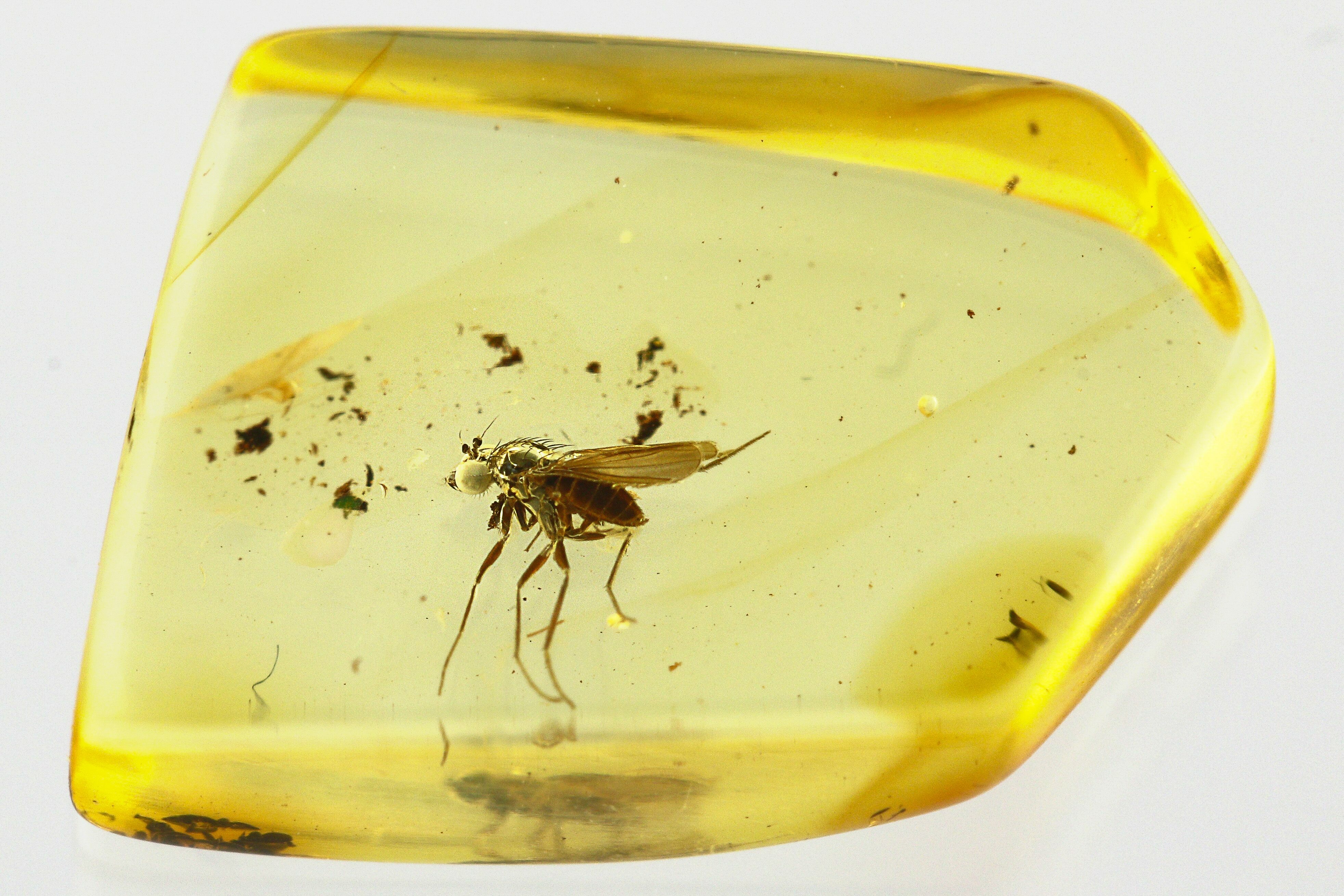 This specimen features a detailed, 44 million year fossil long-legged fly (order Diptera - family Dolichopodidae) preserved in a piece of Baltic amber. Including appendages, the fly measures approximately 3.1mm long.