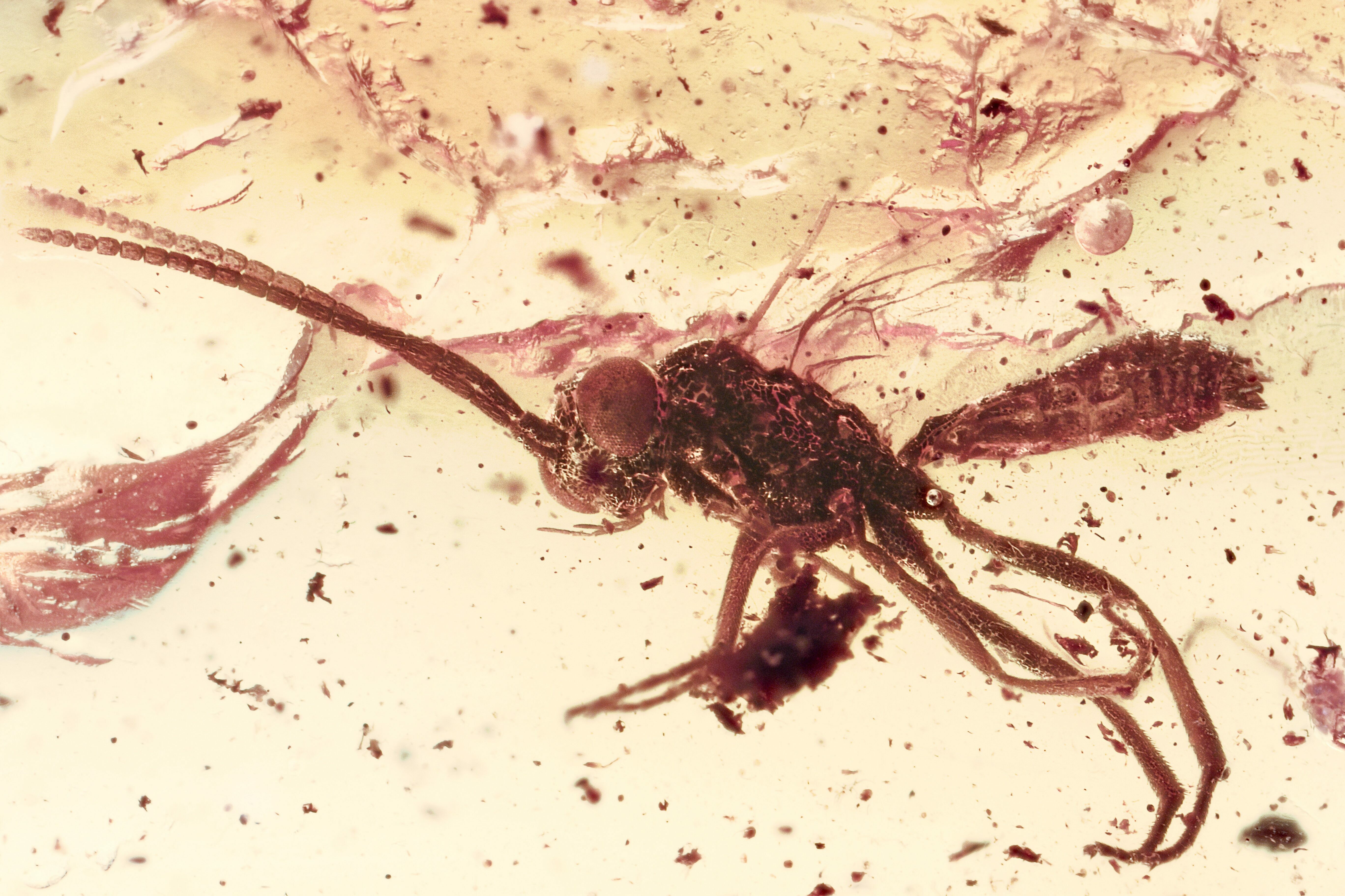 This is a detailed 44 million year old, male fossil ichneumon wasp (family Ichneumonidae) preserved in Baltic amber. The length of the wasp is about 3.9mm including appendages.