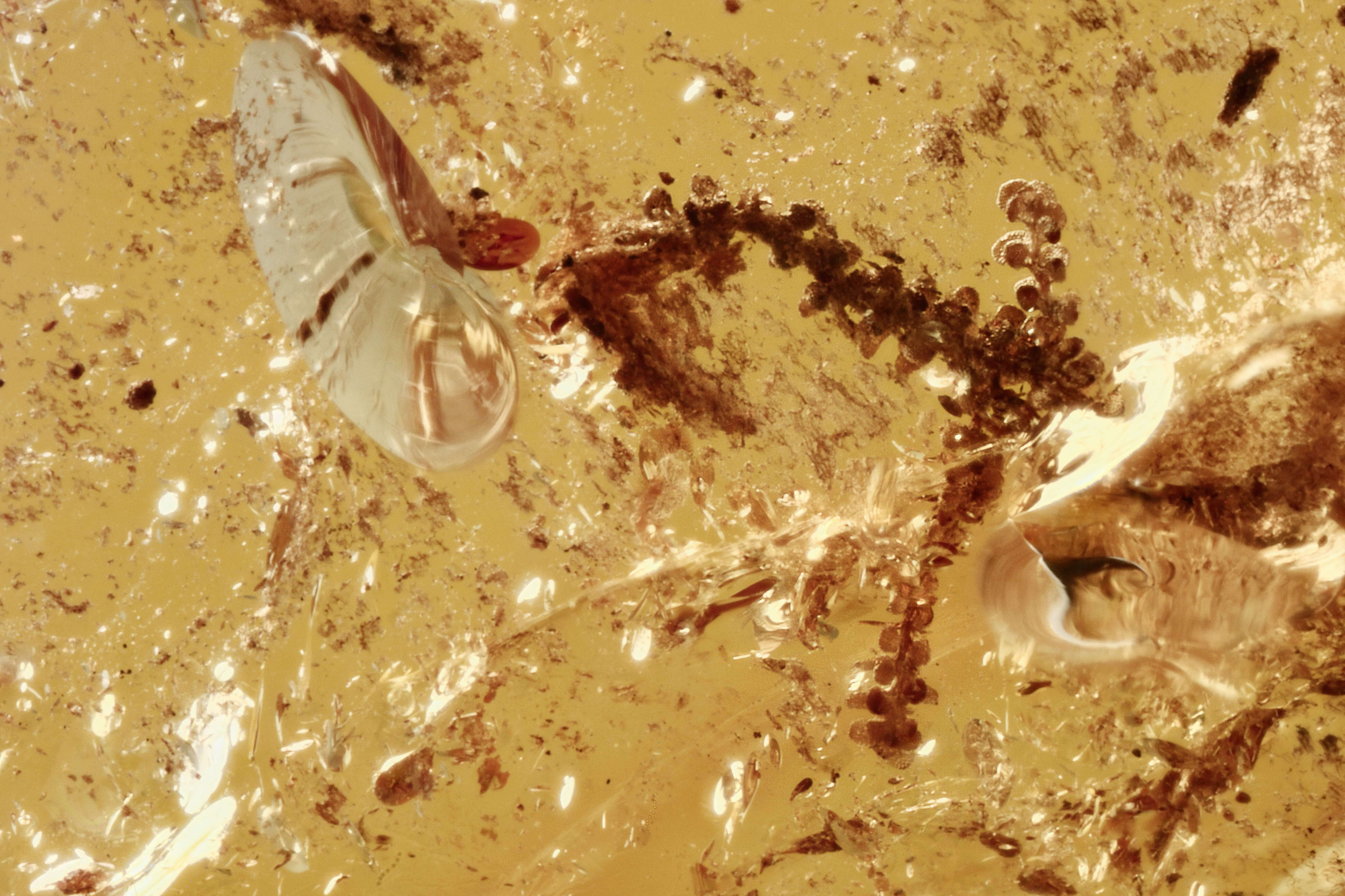 This is detailed 44 million year old fossil moss (Bryophyta) preserved in Baltic amber.