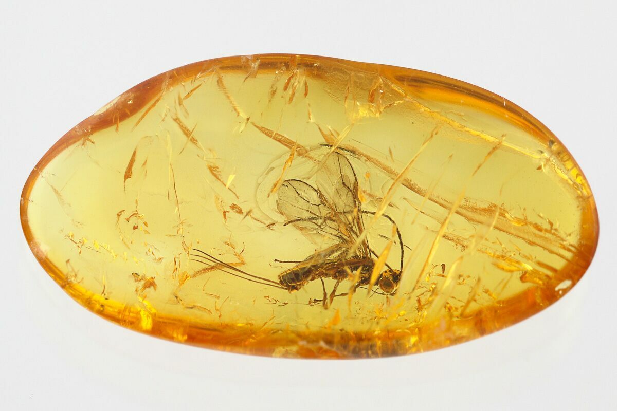 This specimen features a detailed, 44 million year fossil parasitoid wasp (family Braconidae) preserved in Baltic amber. The wasp measures about 4.8mm long.