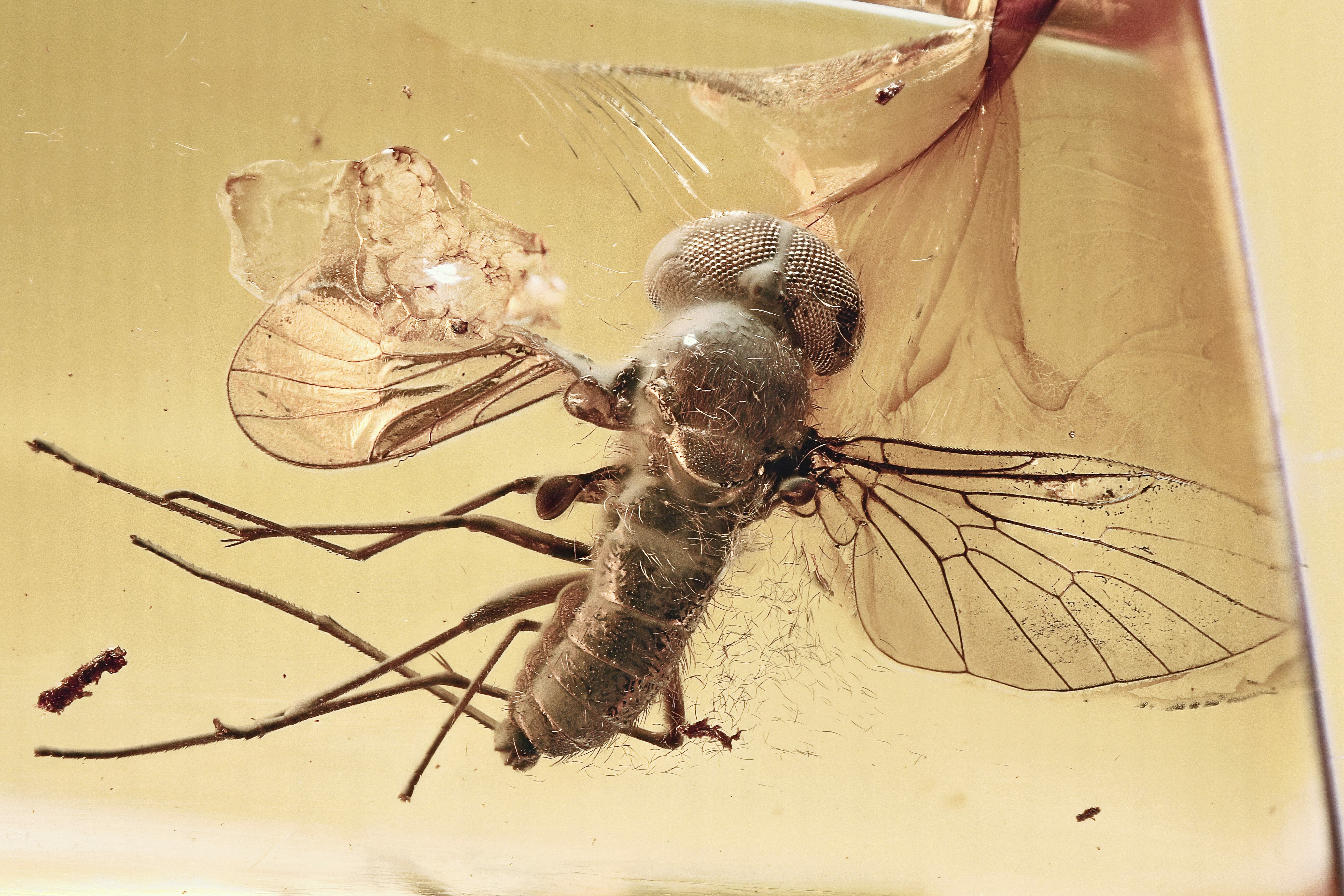 This is a large and beautifully detailed 44 million year old fossil snipe fly (order Diptera - family Rhagionidae - genus Rhagio) preserved within a piece of Baltic amber. The wingspan of the fly is about 7.1mm.