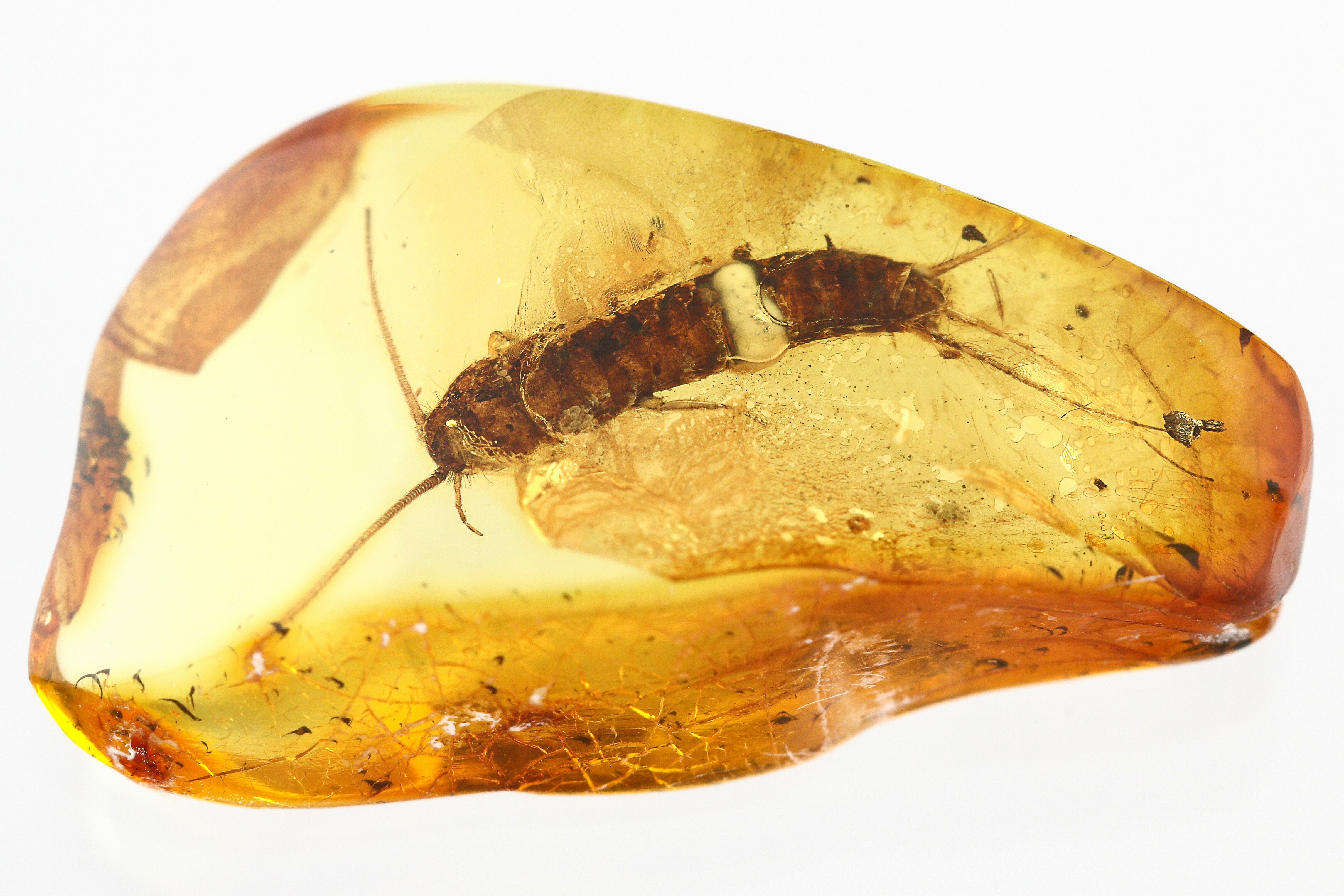 Silverfish about 15mm long, Amber: 19 x 10 x 5mm