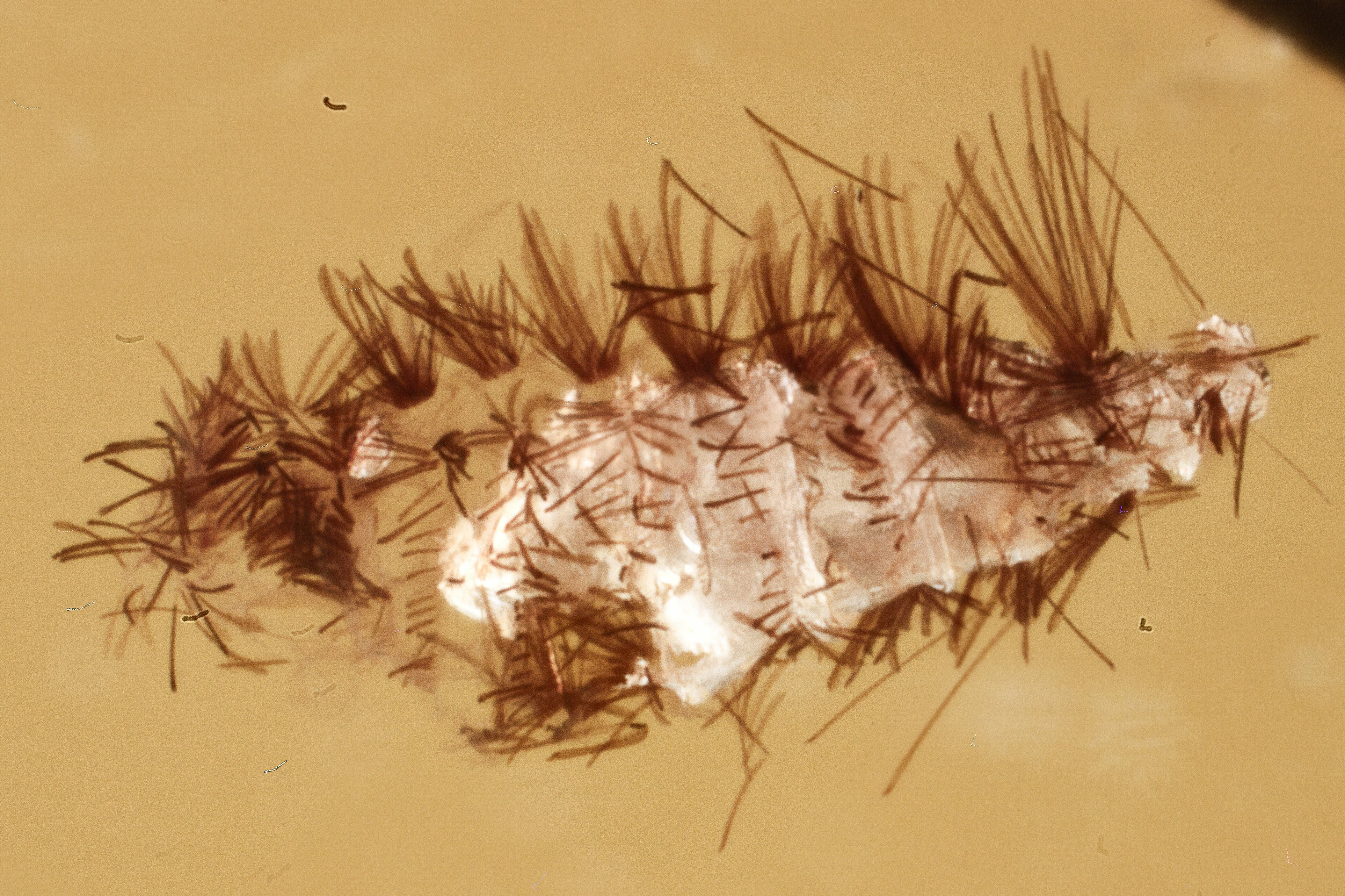 This is a detailed, 44 million year old fossil soft millipede (order Polyxenida - family Polyxenidae) preserved in Baltic amber. The millipede measures about 1.6mm long.