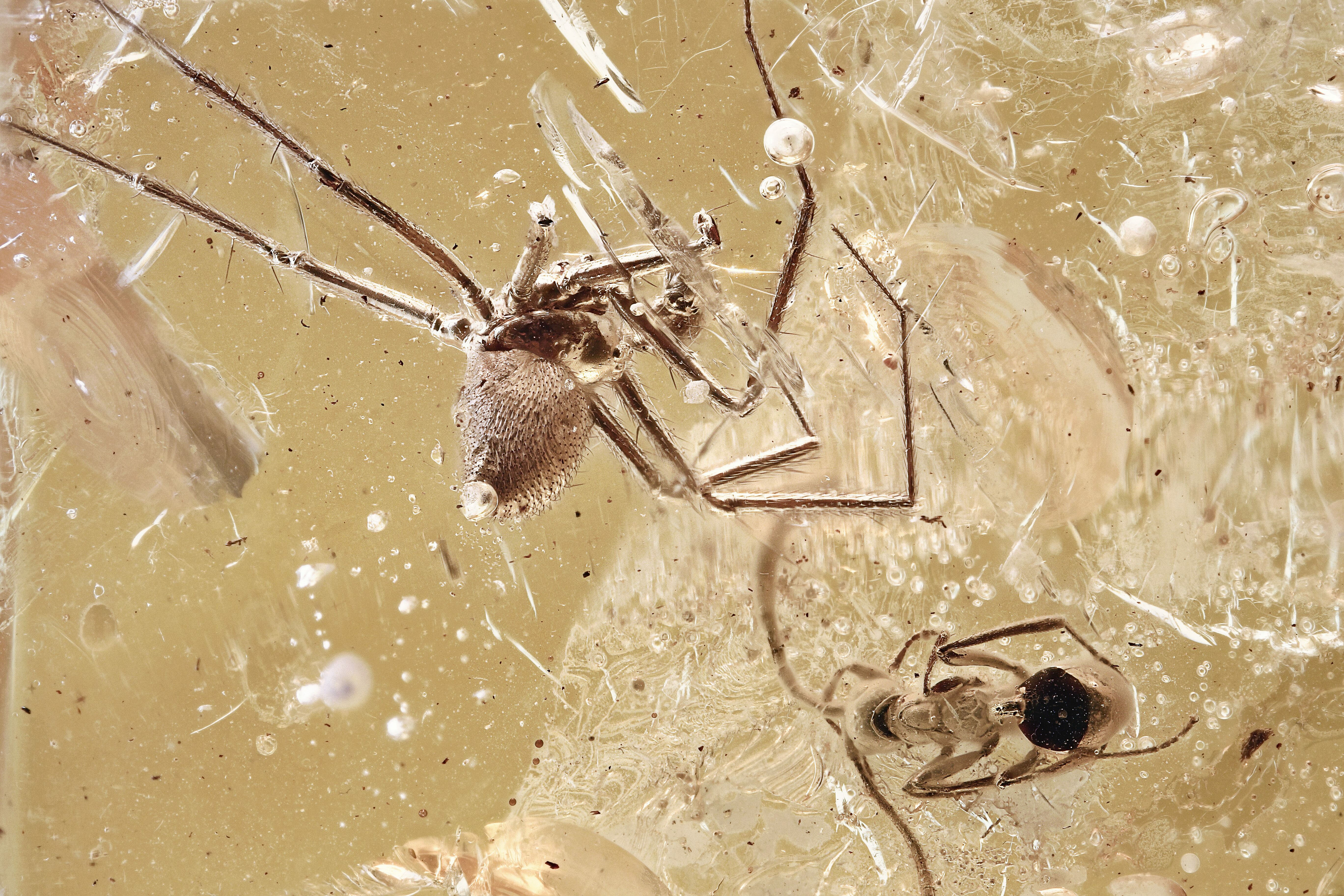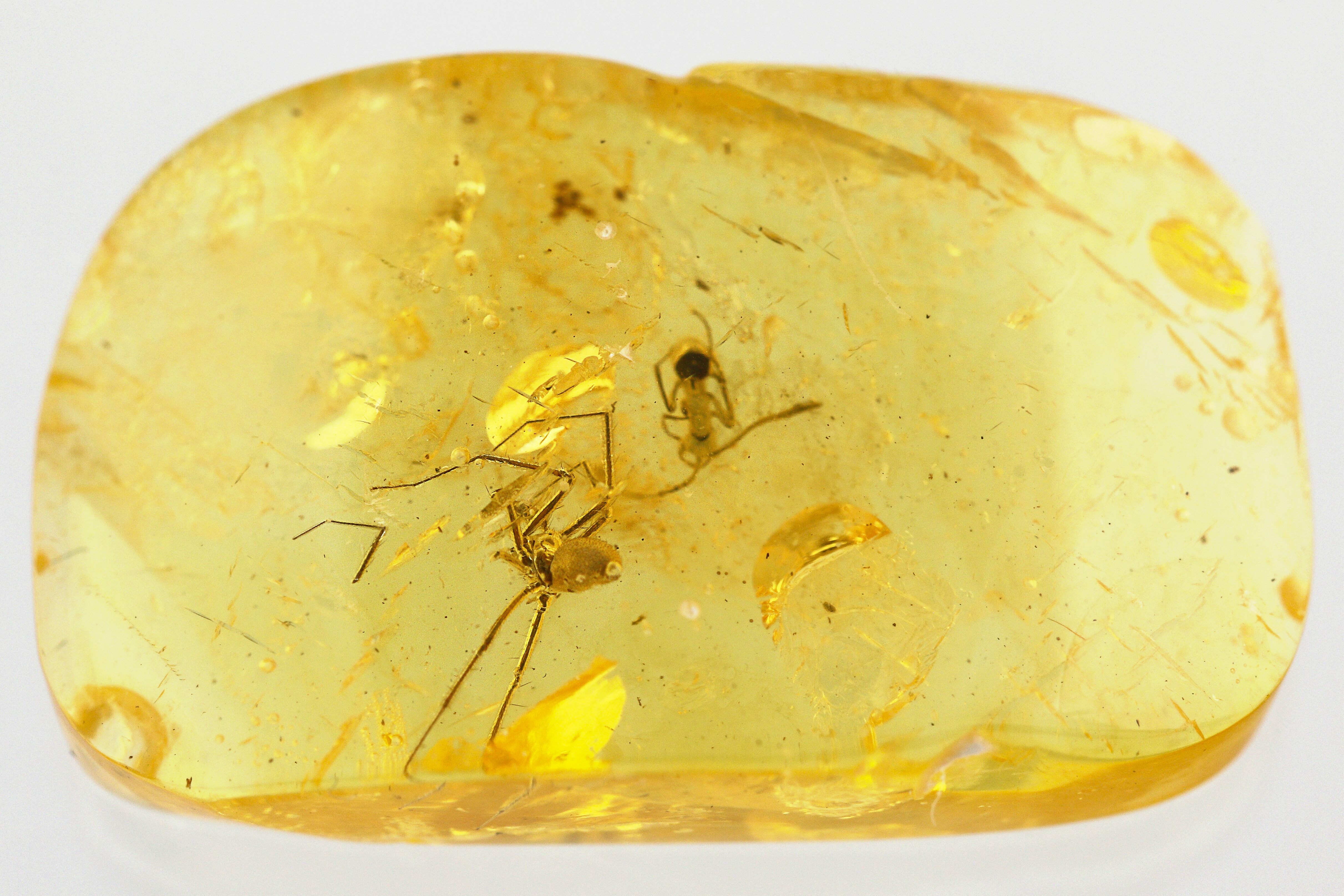 This is a beautifully detailed fossil spider (order Araneae) and ant (family Formicidae) preserved in Baltic amber. The spider inclusion measures about 7mm wide in a 21 x 12 x 5mm piece of amber.