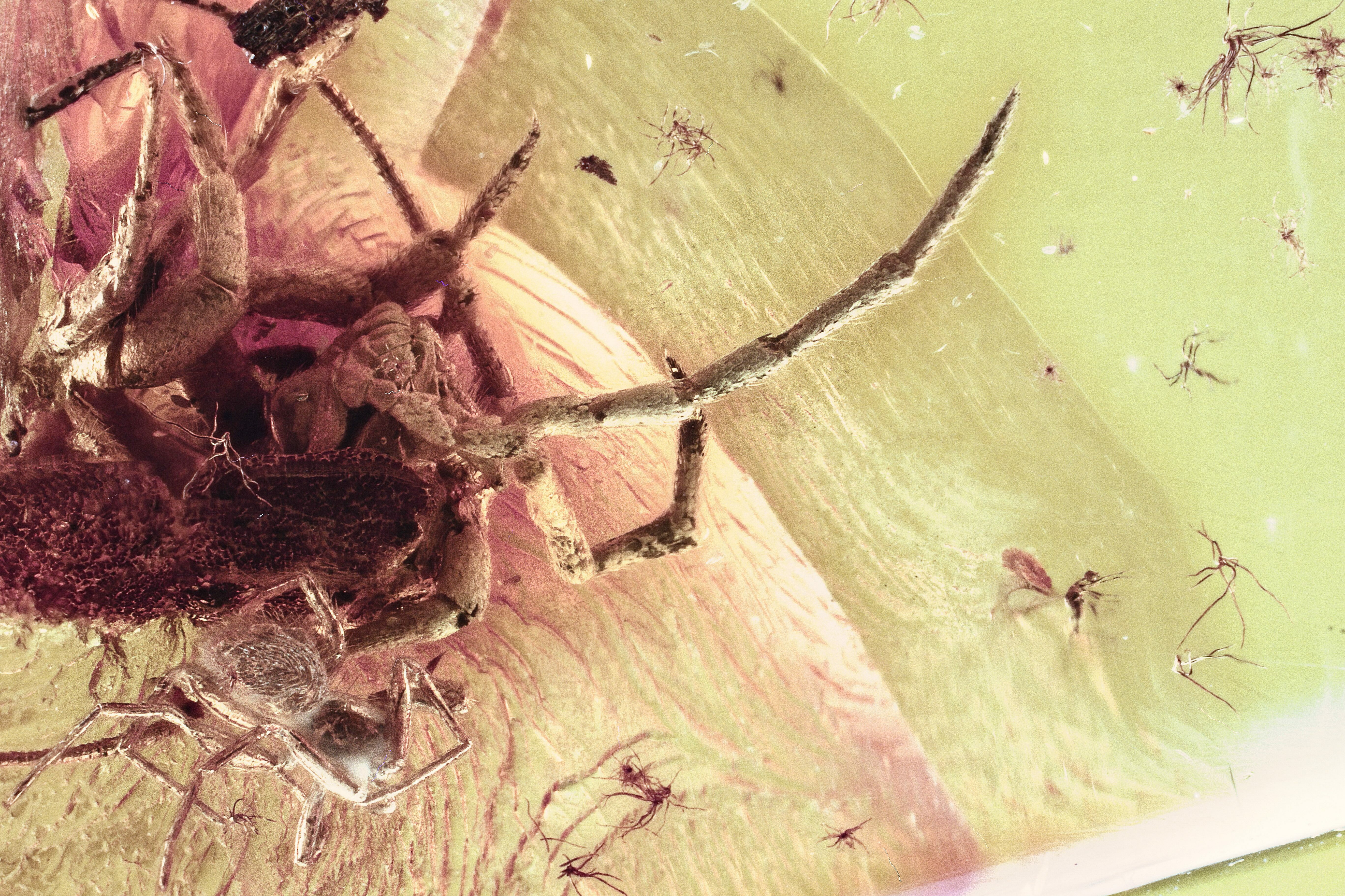 This is a detailed fossil spider (order Araneae) preserved alongside the head of a bristletail in Baltic amber. This inclusion measures about 7.3mm wide including appendages in a 31 x 12 x 6mm piece of amber.