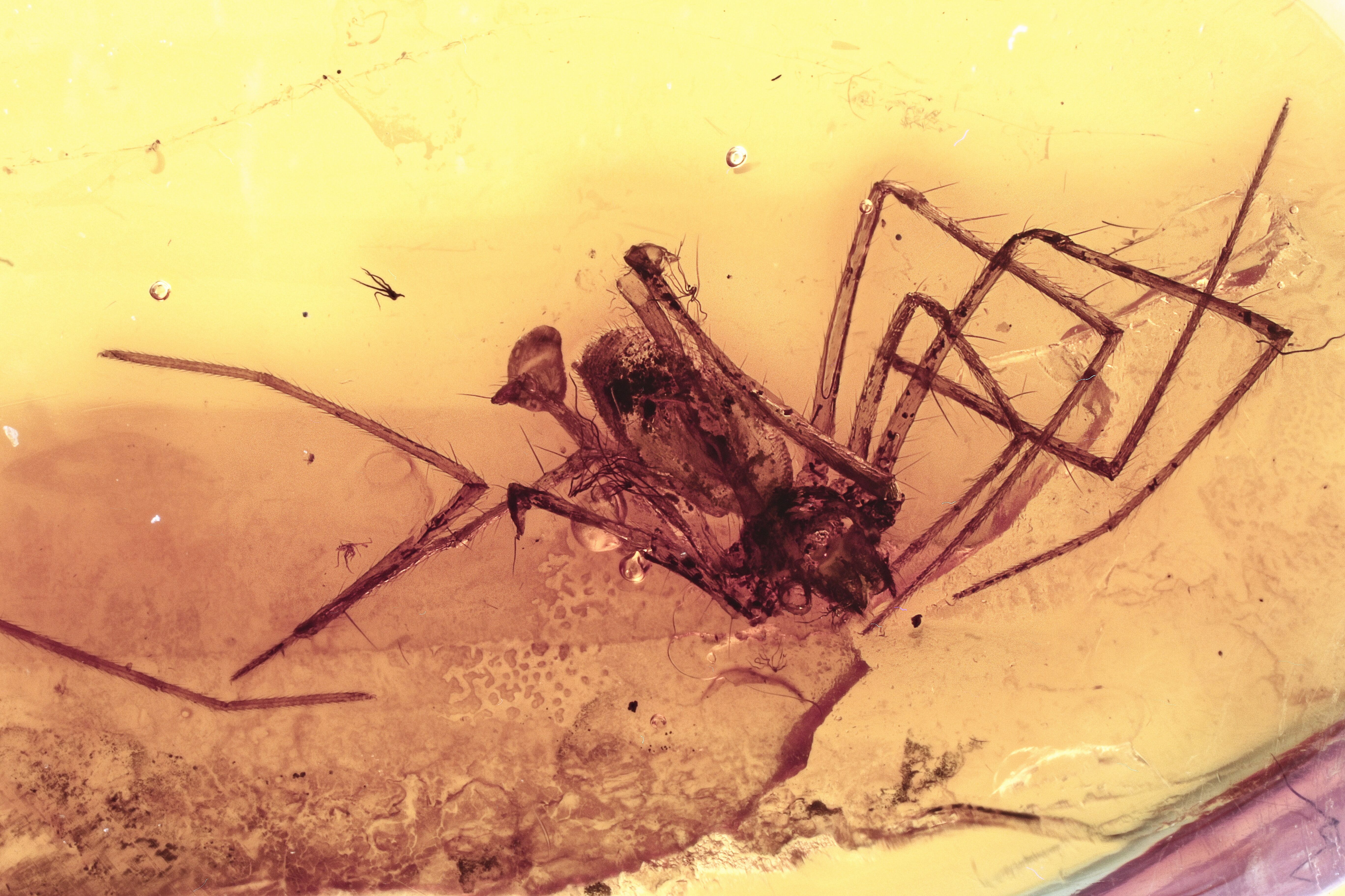 This is a detailed fossil spider (order Araneae) preserved in Baltic amber. This inclusion measures about 6.8mm wide including appendages in a 14 x 9 x 3mm piece of amber.