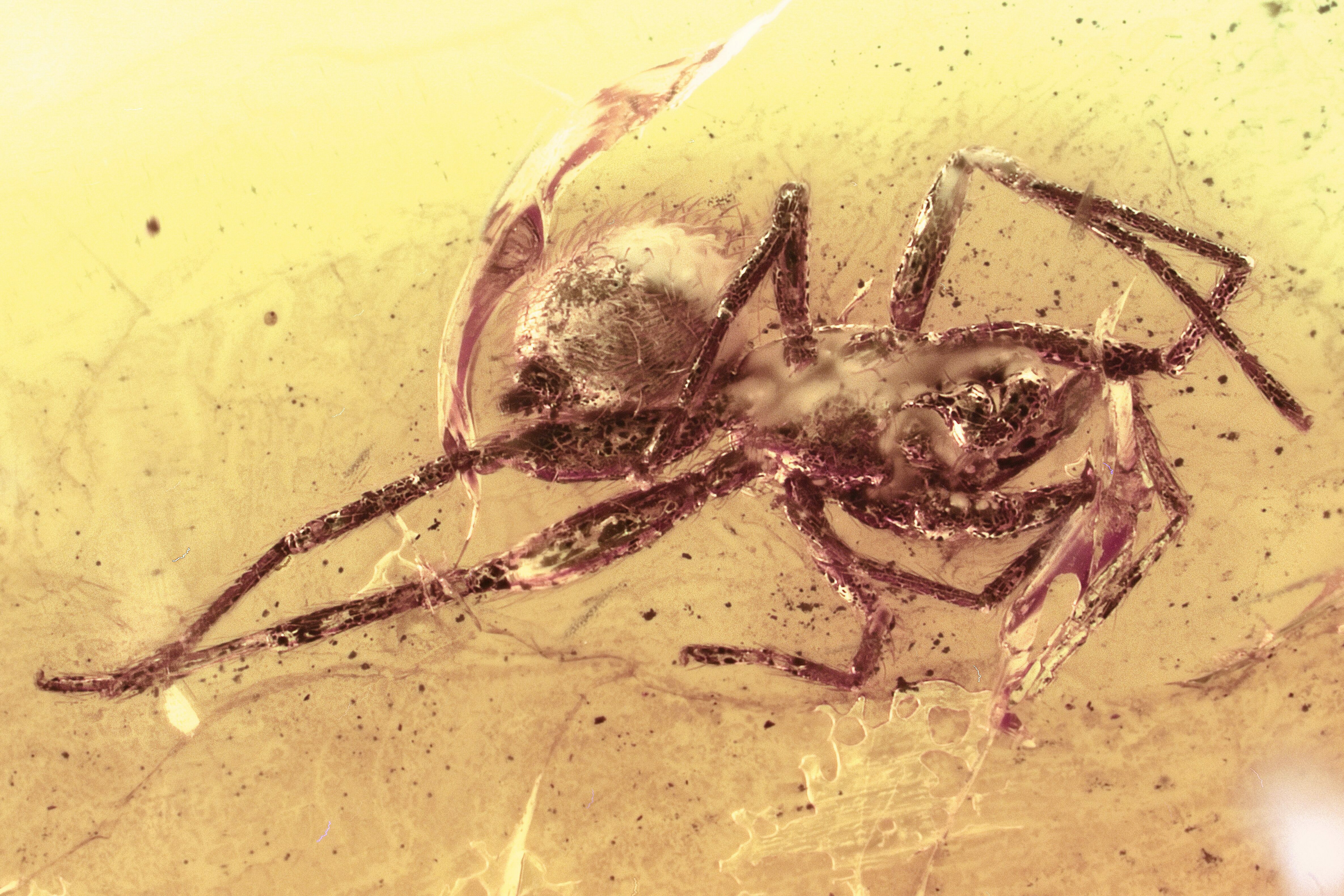 This is a small but detailed fossil spider (order Araneae) preserved in Baltic amber. This inclusion measures about 2.7mm wide including appendages in a jewelry-sized piece of amber.