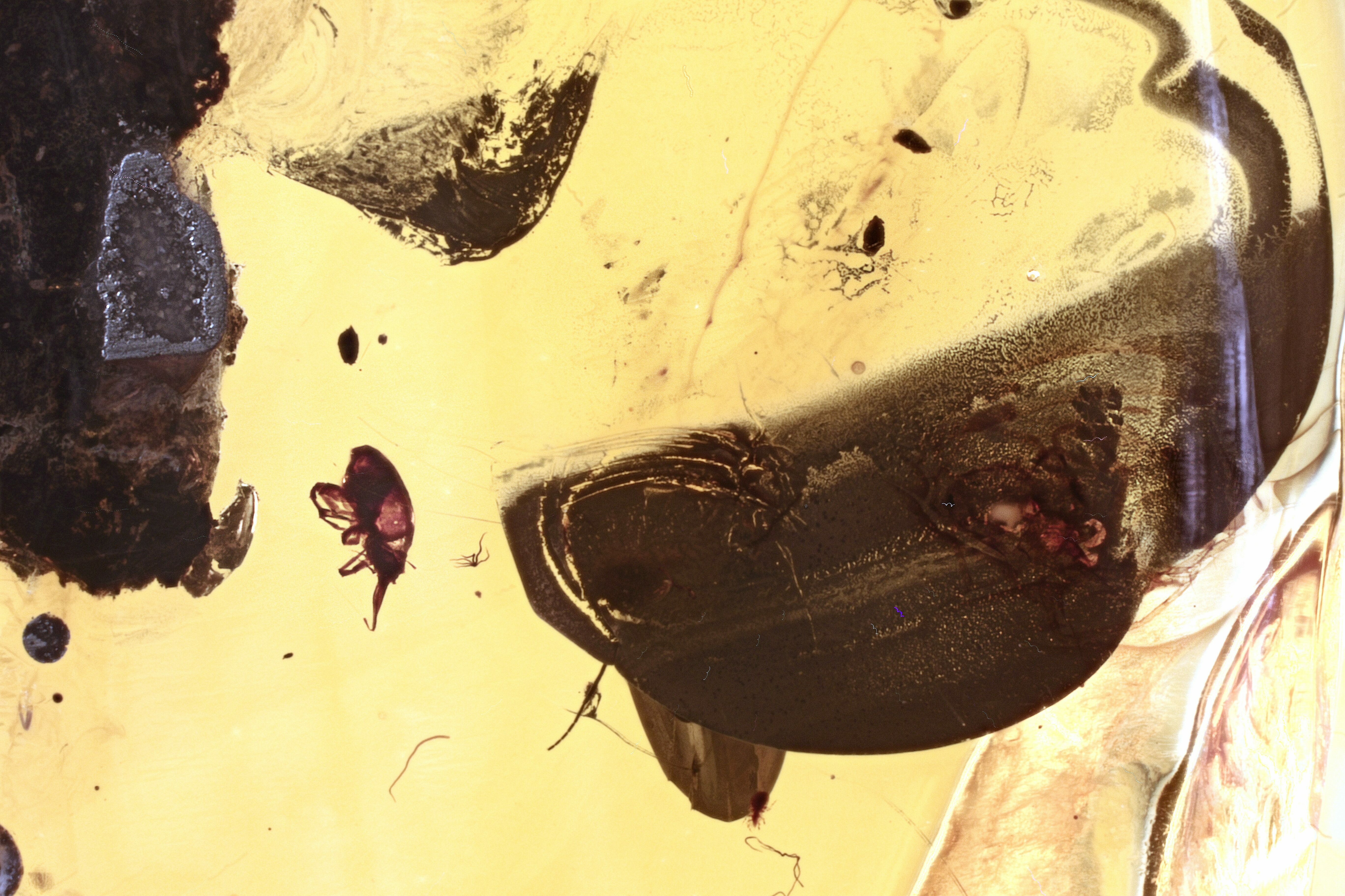 Detailed Fossil Spider, Mite, and Pyrite in Baltic Amber