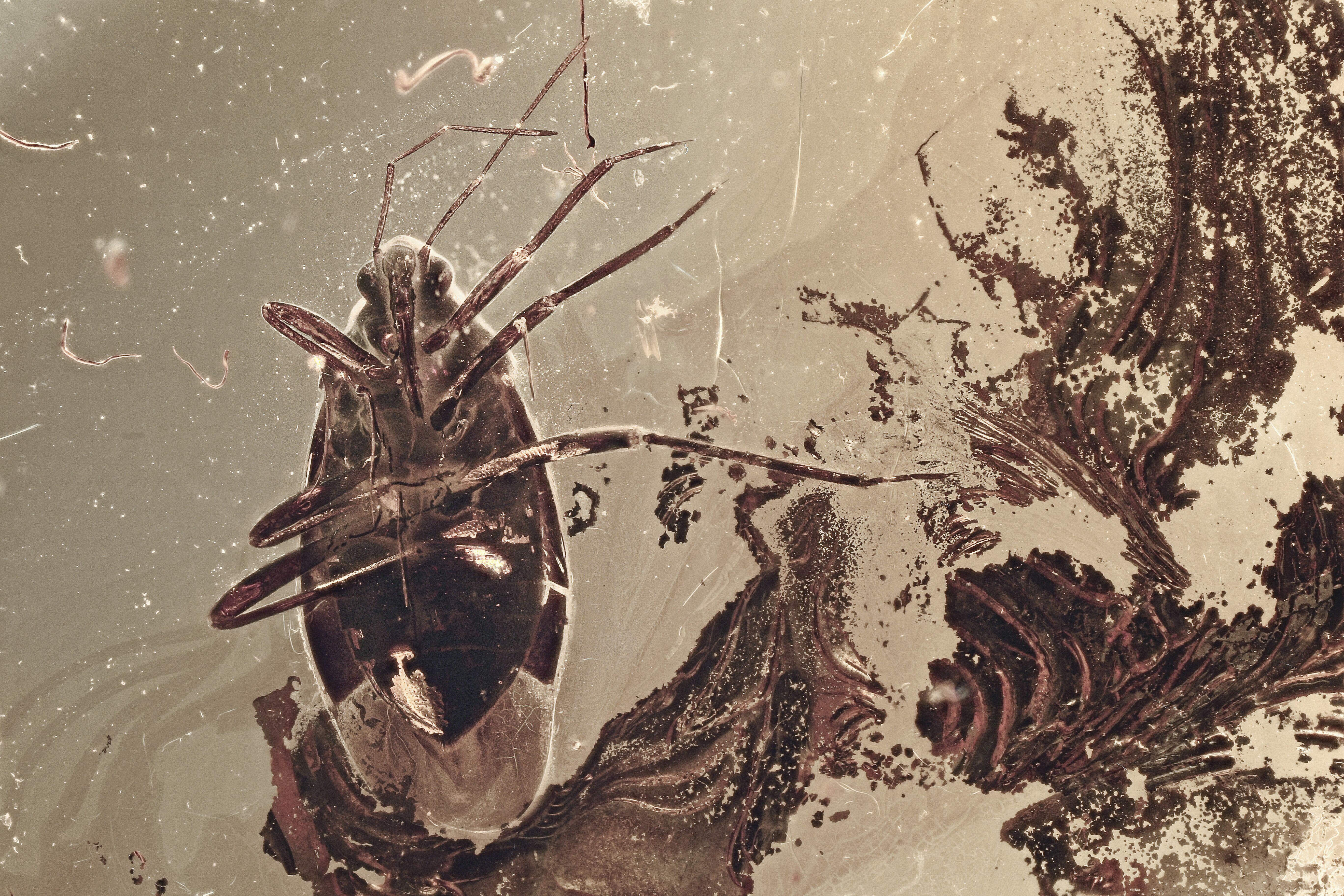 This is a 44 million year old fossil true bug (suborder Heteroptera - family Miridae?) preserved in Baltic amber. The true bug measures about 1.8mm long.