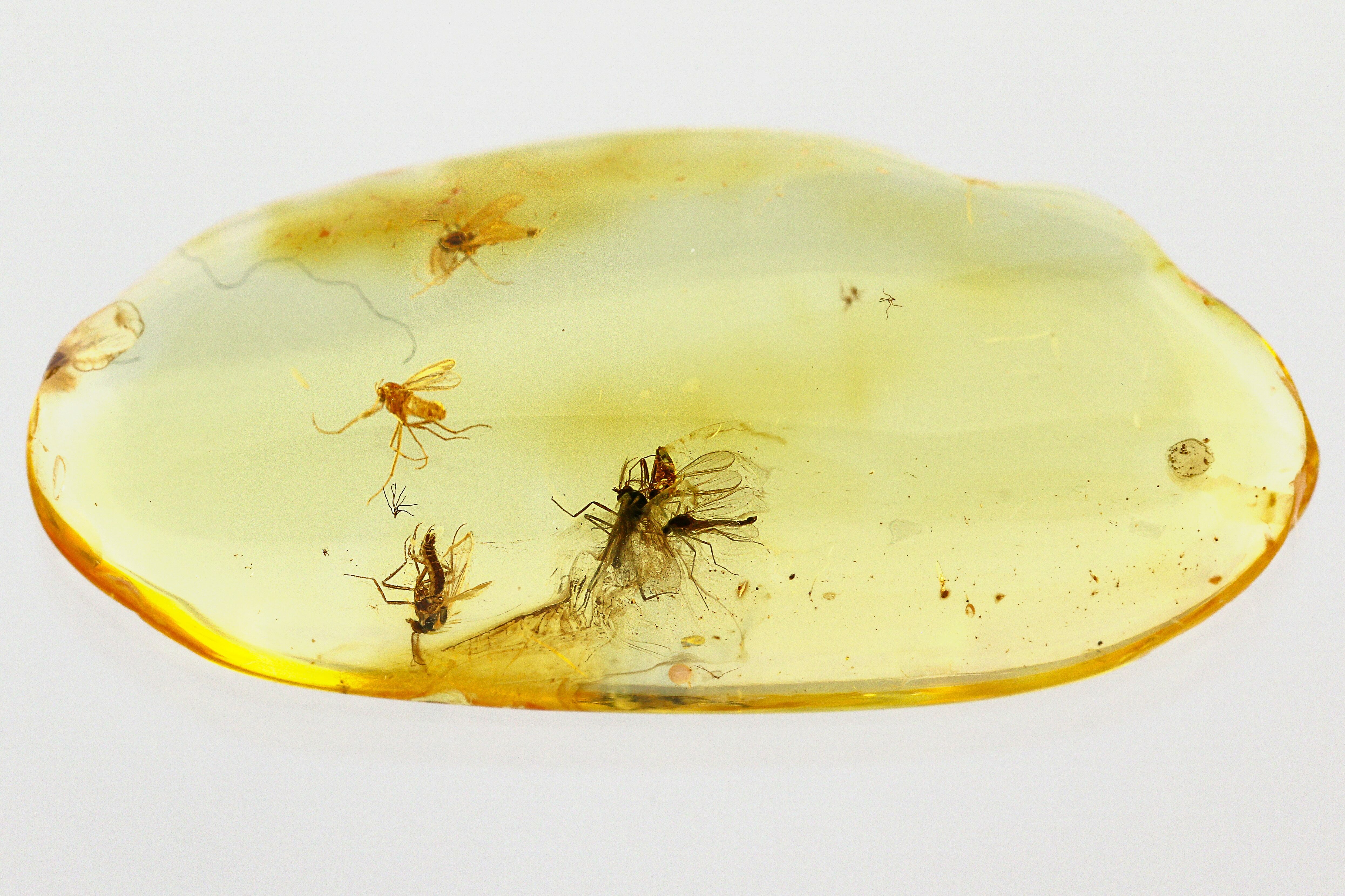 This is a swarm of six, 44 million year fossil true midges (order Diptera - family Chironomidae) preserved in Baltic amber.