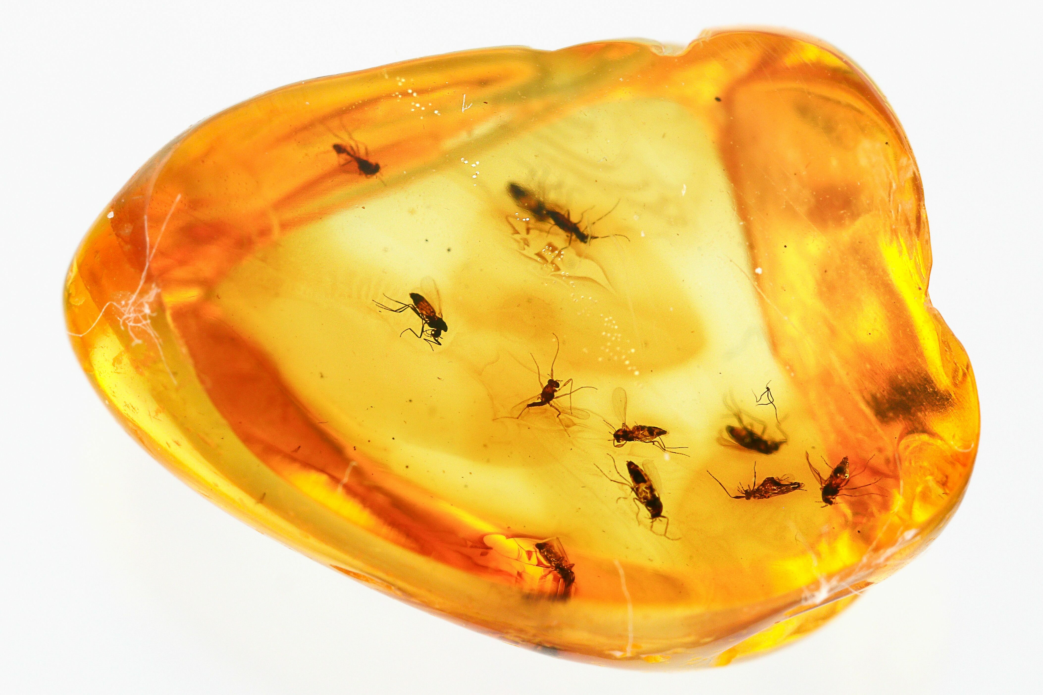 This is a swarm of 11, 44 million year fossil true midges (order Diptera - family Chironomidae) preserved in Baltic amber.
