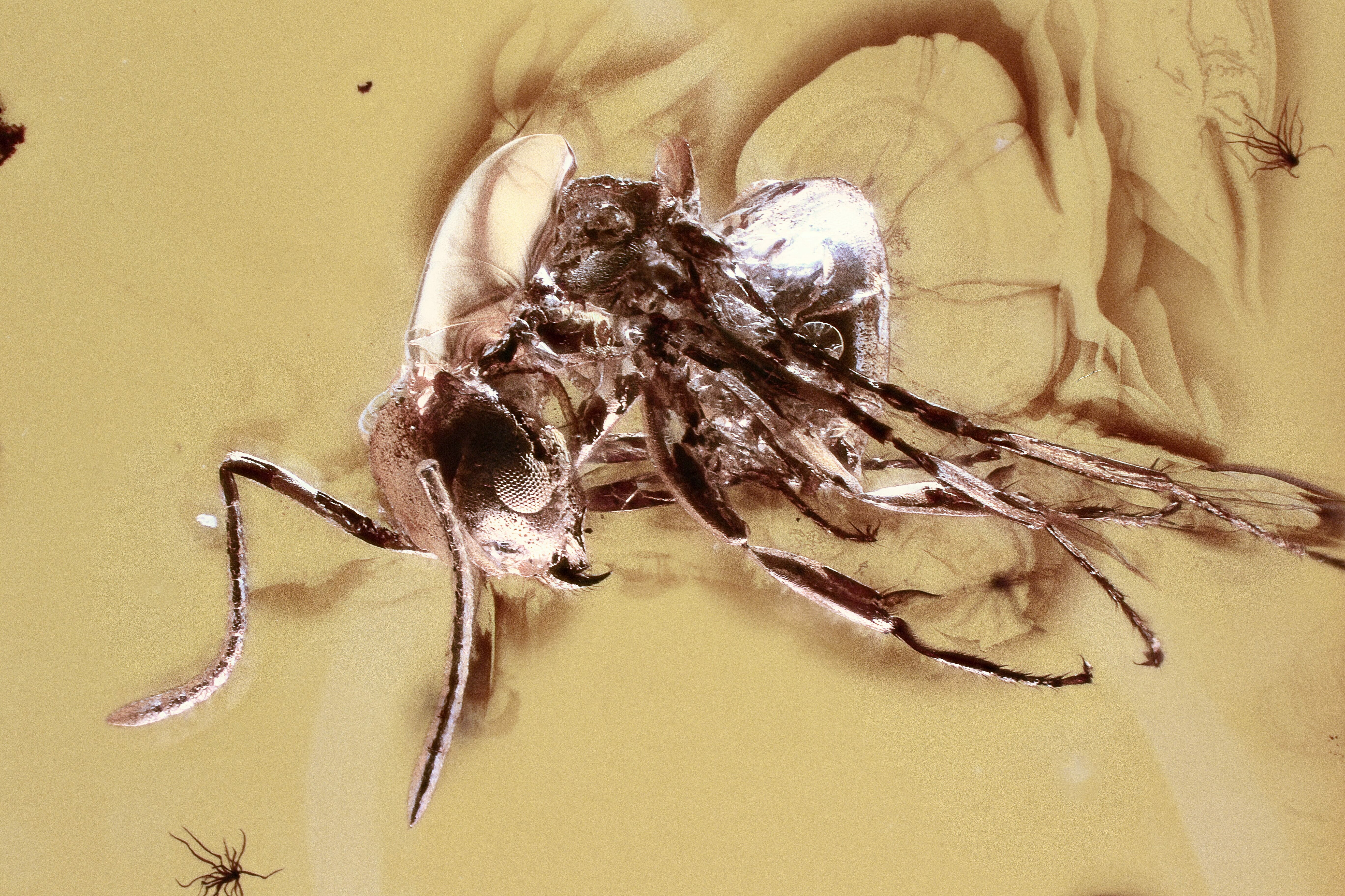This is a detailed, 44 million year old fossil ant (subfamily Formicinae - genus Asymphylomyrmex) preserved in Baltic amber. The length of the ant, including appendages and antennae, is about 3.1mm in a 12 x 11 x 4mm piece of amber.