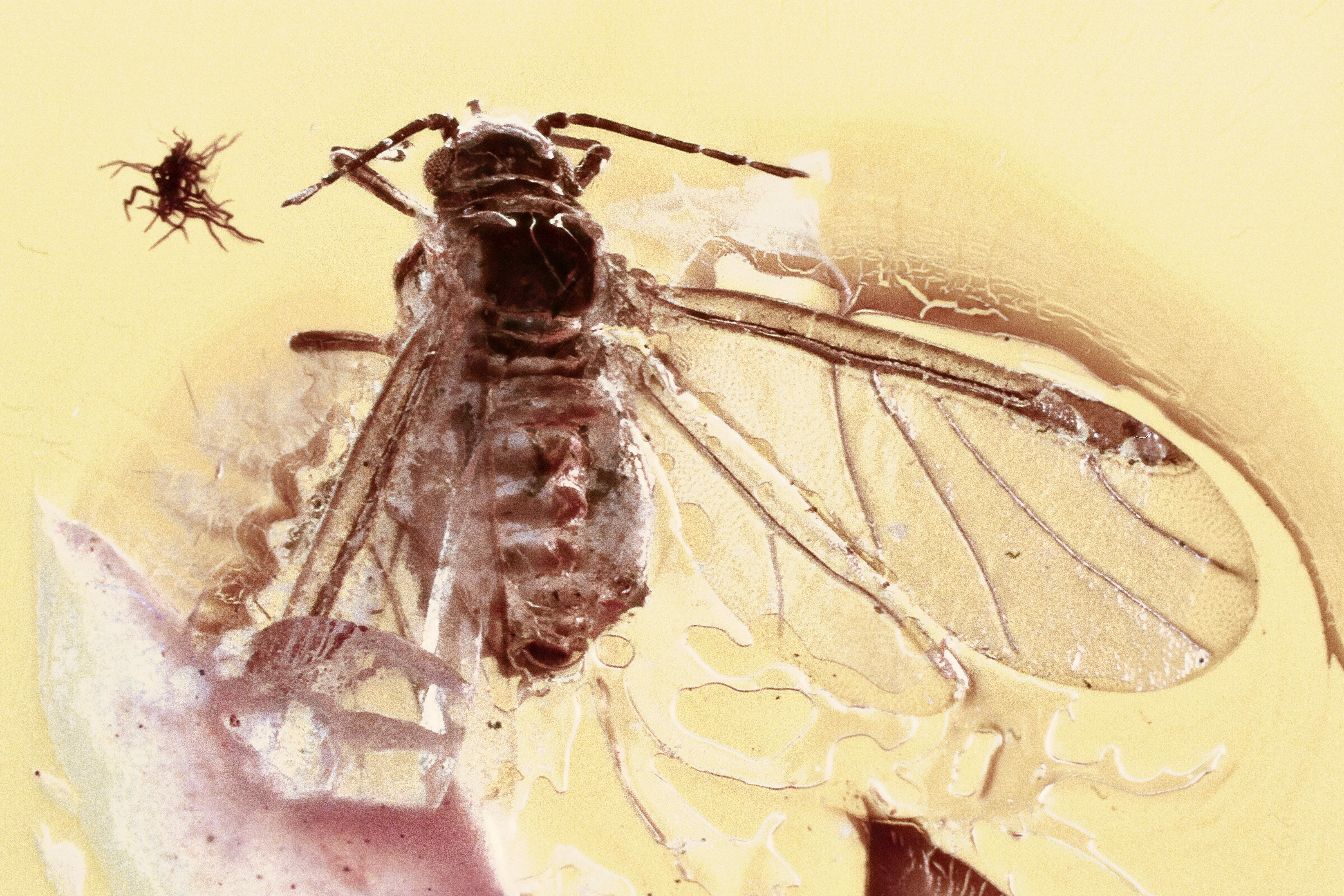 This 44 million year old piece of Baltic amber contains a preserved fossil winged aphid from the superfamily Aphidoidea.