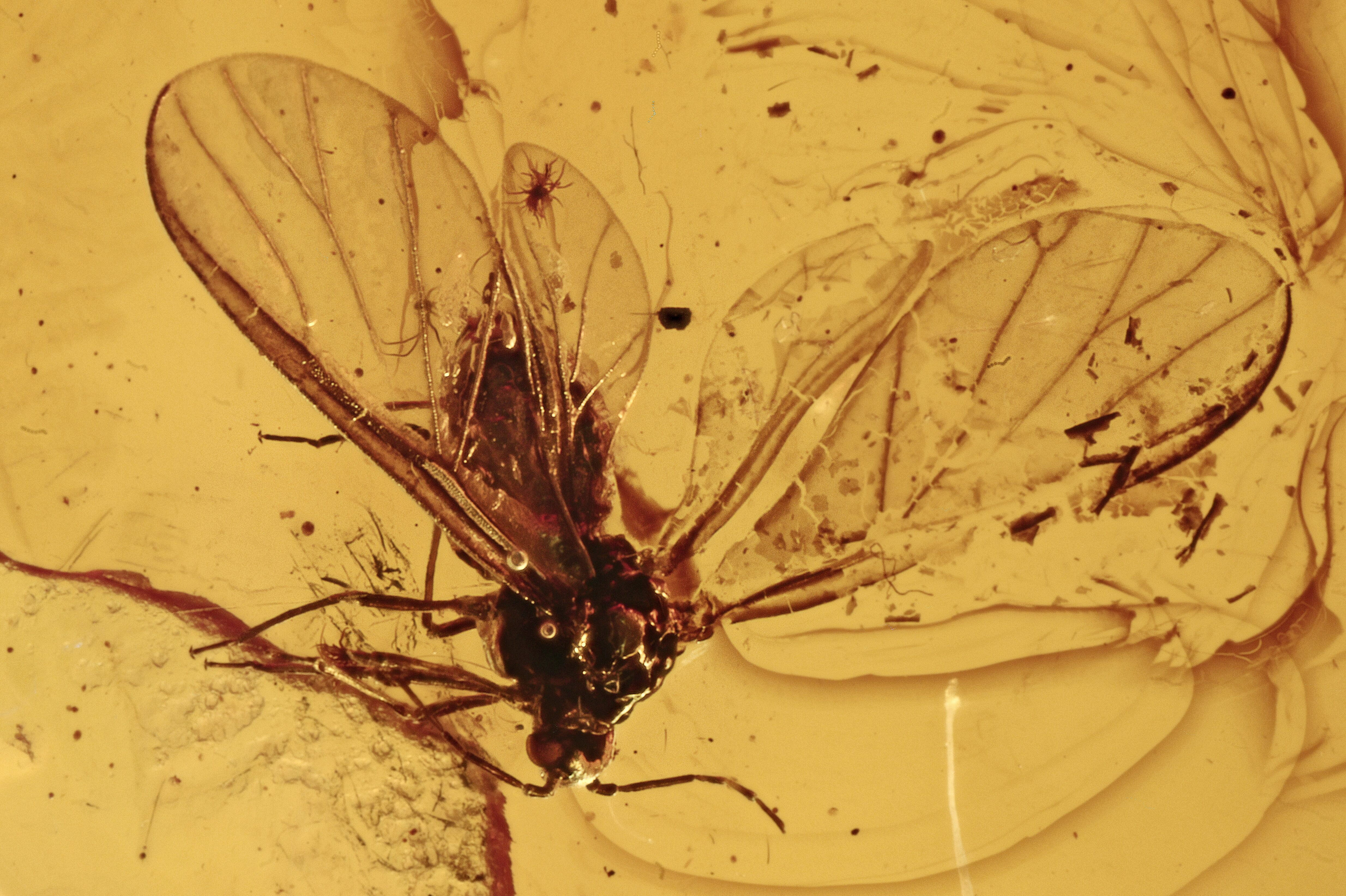 This 44 million year old piece of Baltic amber contains a fossil winged aphid (order Hemiptera). The wingspan of this aphid measures about 4mm long.