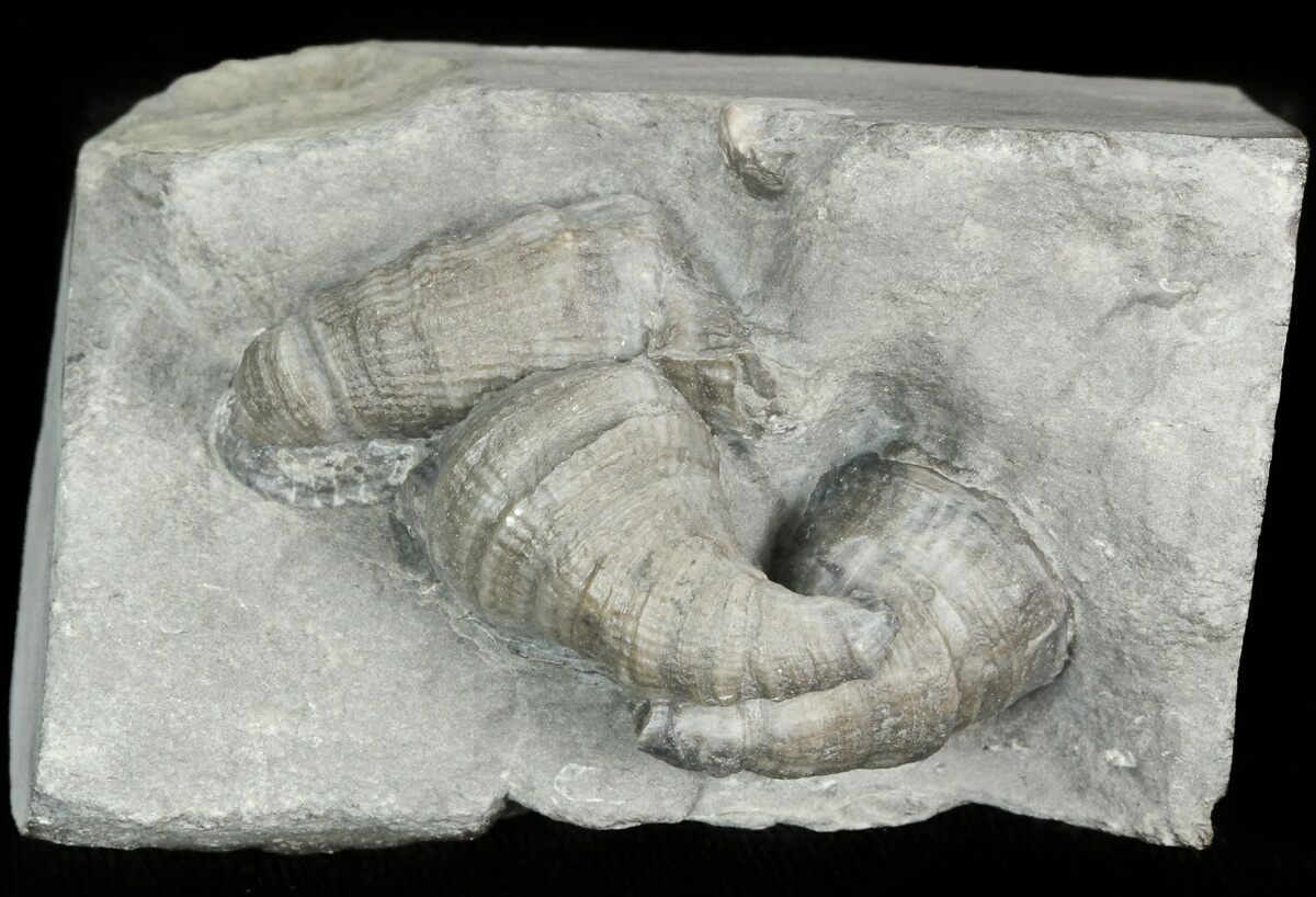 This is a cluster of fossil horn coral (Stereolasma rectum) from the Windom Shale of NY. It's Devonian in age, or approximately 385 million years old. It has been prepared under microscope using air abrasives to reveal all of the surface detail. The rock underneath it has been sawed up so it stands up on a flat surface and displays quite nicely.