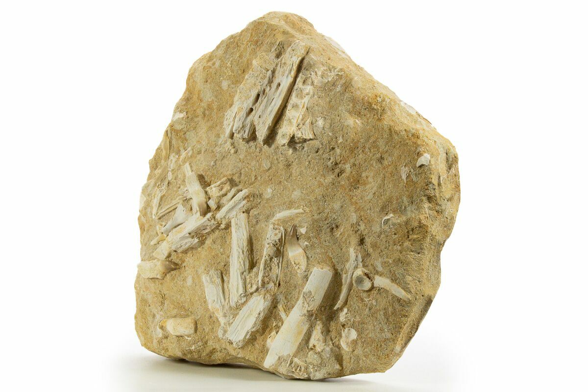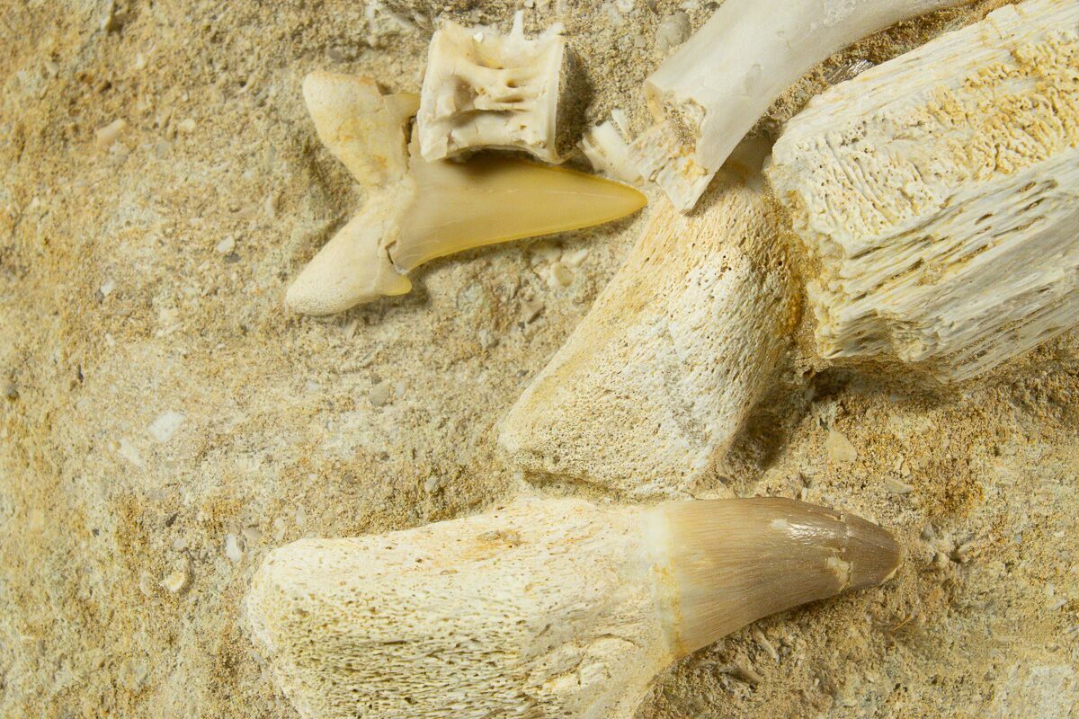 This 13.2" wide section of sandstone from the Phosphate Deposits of Morocco contains a disarticulated mosasaur jaw, along with an assemblage of additional fossils. Four rooted mosasaur teeth can be seen exposed from the rock as well as an Otodus shark tooth, fish vertebrae, and an Enchodus fish fang. There are almost a dozen mosasaurs described from these deposits, but based on the teeth it is most likely from the species Pluridens serpentis.