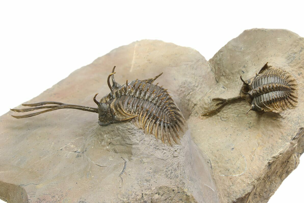 This is a double Walliserops trifurcatus specimen from Foum Zguid, Morocco. There are two fantastically prepared examples of this spiny species of trilobite naturally associated together in the same rock. The larger specimen is 2.6" long and the smaller is 1.6" long. They both have dozens of free-standing spines, excellent preparation and no restoration.