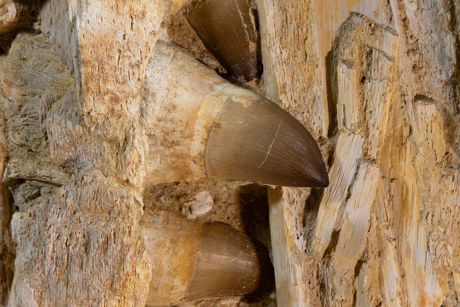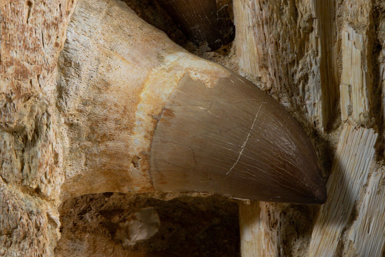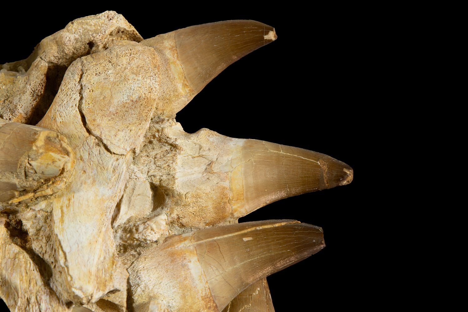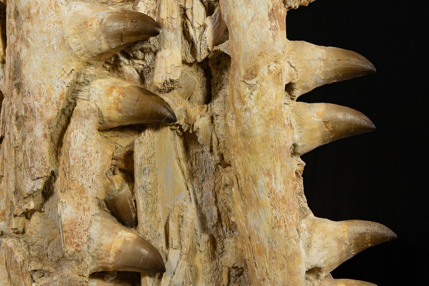 This is a spectacular fossil mosasaur (Thalassotitan atrox) left and right dentary from the Phosphate Deposits near Khouribga, Morocco. The jaw is fragmented in spots and held together by the rock in which it was found. There are 23 total teeth exposed across the specimen; 17 are complete, 2 are unerupted, 2 are incomplete, and there are two more incomplete teeth on the back. A naturally associated crow shark (Squalicorax sp.) can be found within the sandstone between the dentaries.