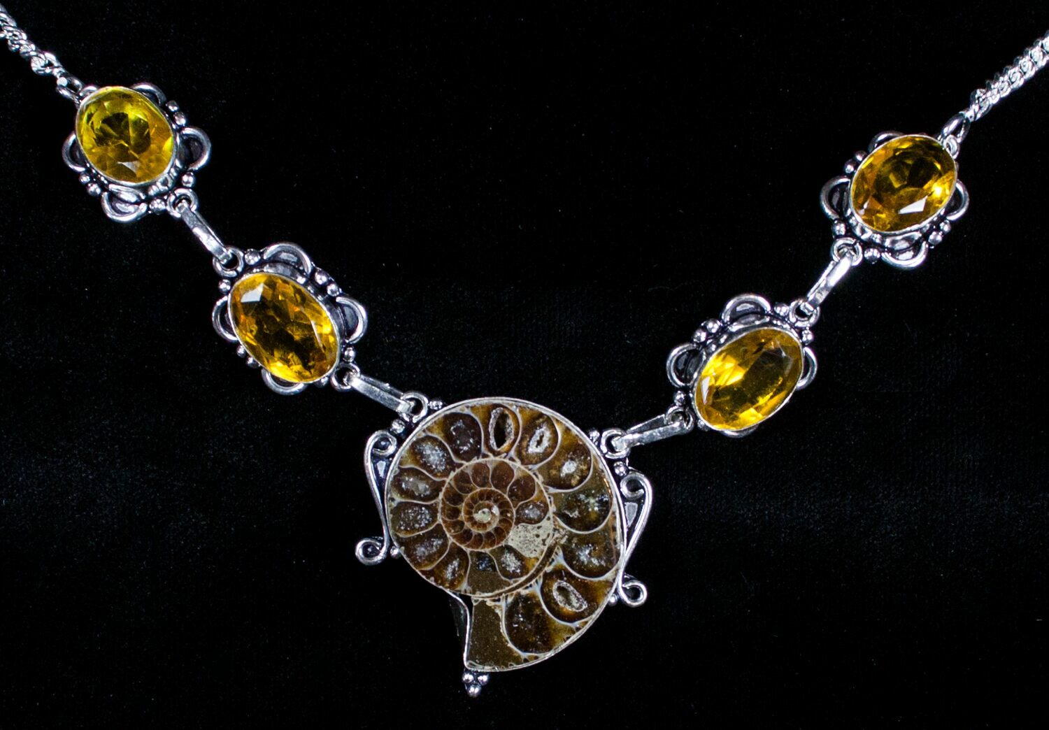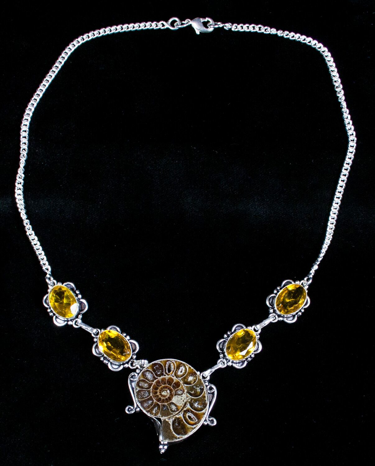 Here is a unique piece of jewelry featuring real cut and polished ammonite fossils from Madagascar and yellow citrine gemstones (lab created). The necklace itself is 18 inches in length.