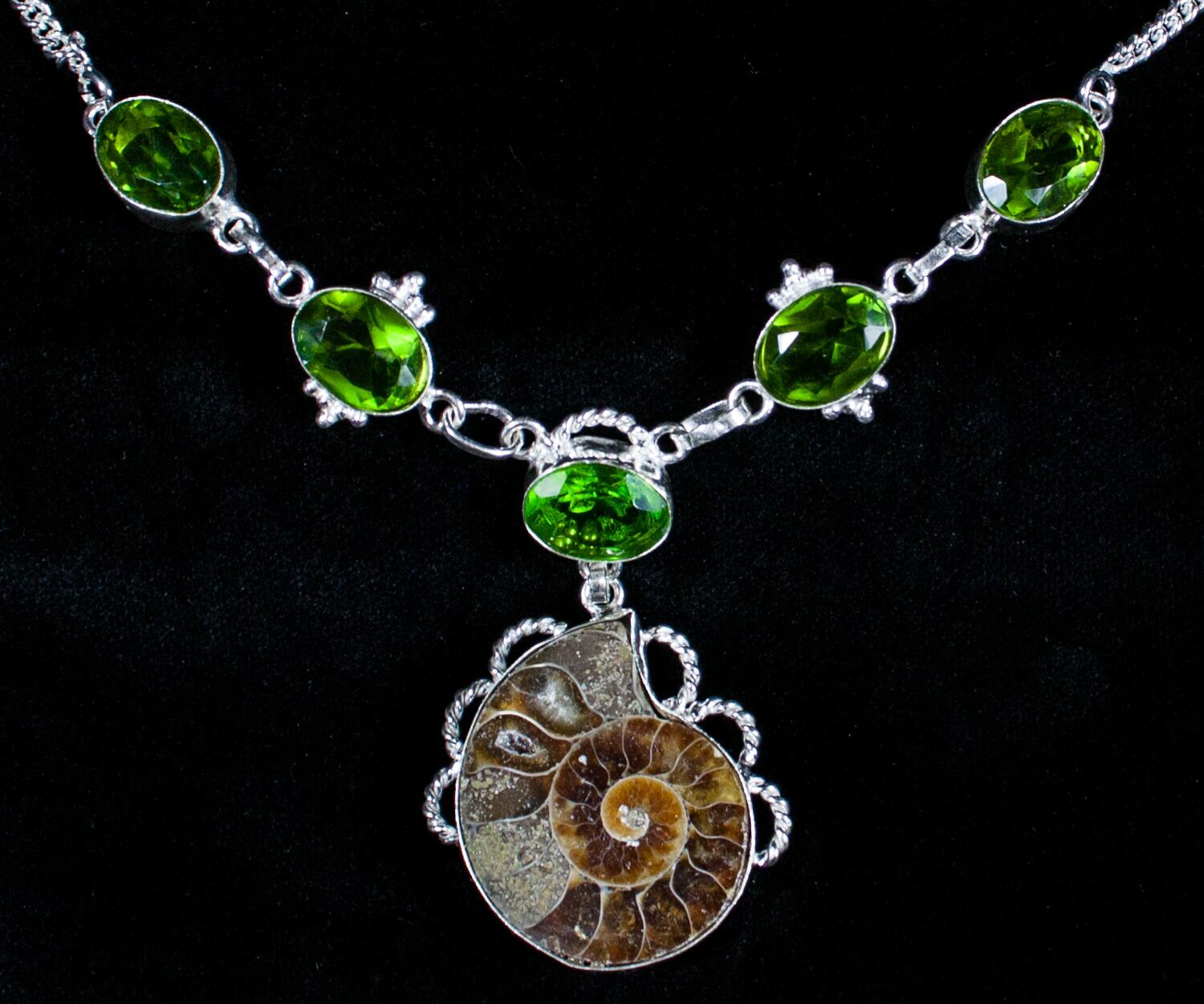 Here is a unique piece of jewelry featuring real cut and polished ammonite fossils from Madagascar and green peridot gemstones (lab created). The necklace itself is 18 inches in length.